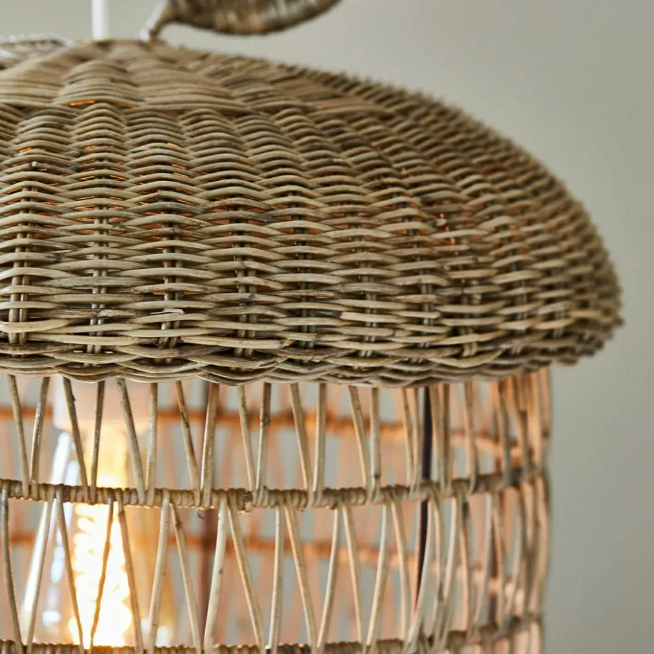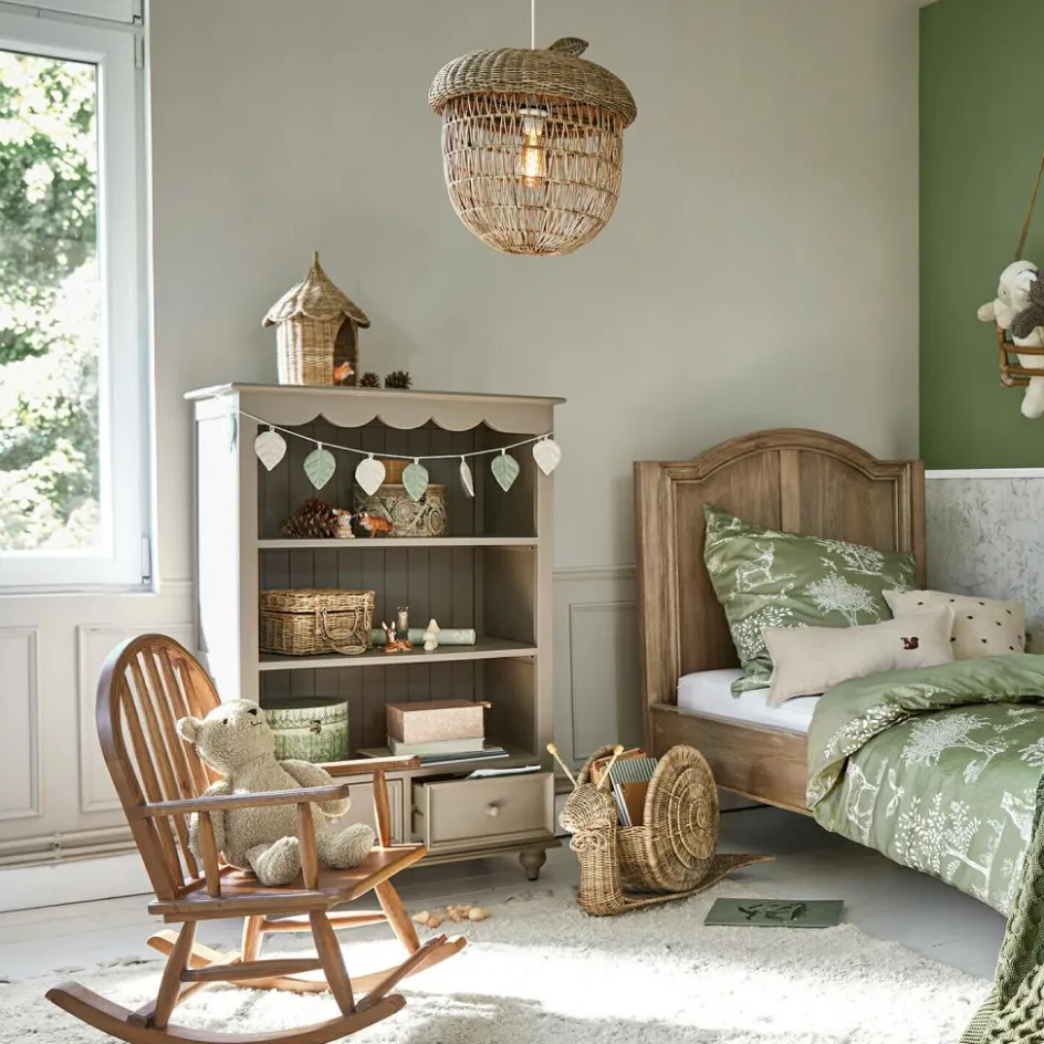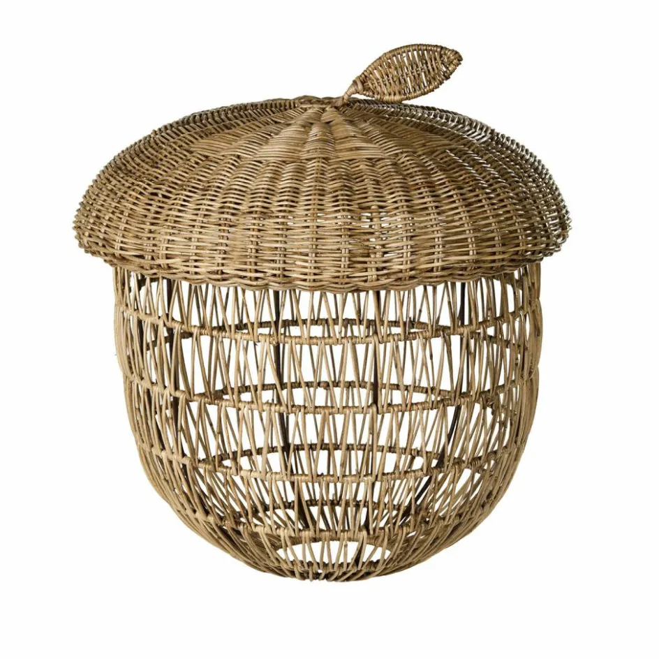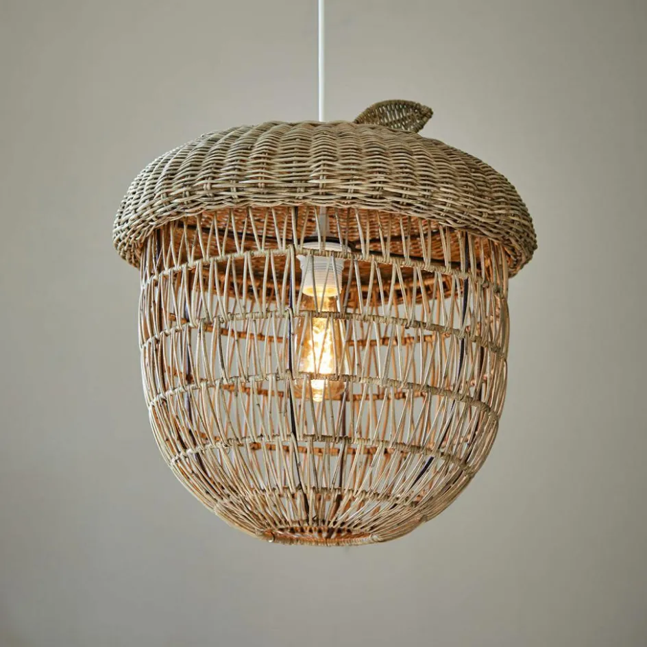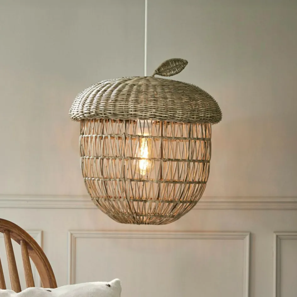 Ein Lichtobjekt, das Geschichten erzählt: Der in liebevoller Handarbeit gefertigte Lampenschirm in Form einer überdimensionalen Eichel erinnert an Waldspaziergänge, raschelndes Laub und neugierige Eichhörnchen. Mit seiner detailreichen Blattspitze und dem sanft schimmernden Naturton bringt er eine herrlich behagliche Stimmung ins Kinderzimmer. Das fein gewebte Rattangeflecht ruht auf einem robusten Eisenrahmen, der dem luftigen Design gleichzeitig Struktur und Stabilität verleiht. Ob über dem Wickeltisch, dem Spielbereich oder dem Bett – dieser Lampenschirm ist weit mehr als nur eine Lichtquelle: Er ist ein dekoratives Highlight, das die Fantasie anregt und eine Atmosphäre von Geborgenheit schafft.