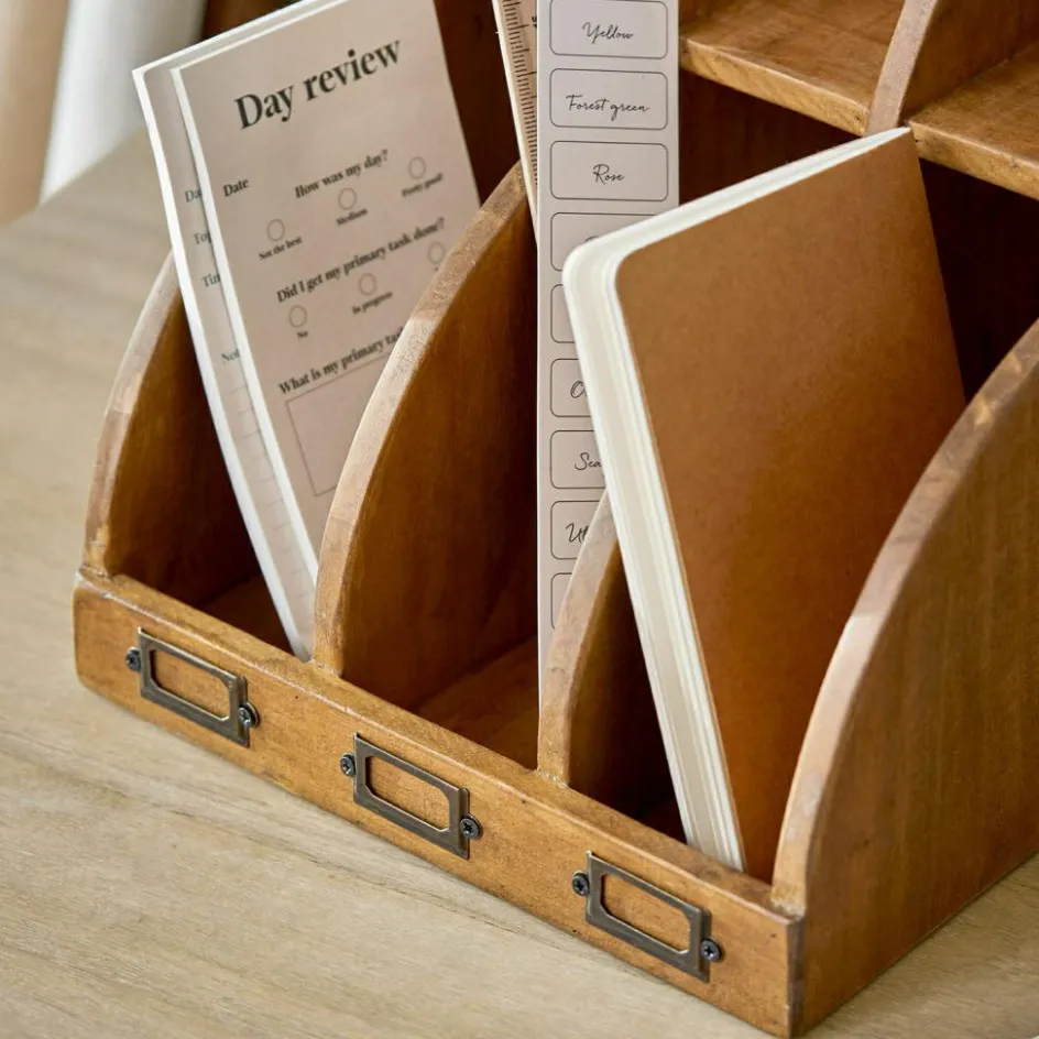 Der Organizer aus warmem Holz bringt natürliche Schönheit und praktische Ordnung in Ihr Zuhause. Sechs perfekt proportionierte Fächer bieten Platz für Ihre wichtigsten Utensilien, sei es auf dem Schreibtisch, in der Küche oder im Eingangsbereich. Die geschwungenen Trennwände verleihen ihm ein harmonisches Design, das sich nahtlos in unterschiedliche Einrichtungsstile einfügt. Besonders charmant sind die Metallschilder an der Unterseite, die eine individuelle Beschriftung ermöglichen und das nostalgische Flair unterstreichen. Seine stabile Verarbeitung und die zeitlose Optik machen ihn zu einem langlebigen Begleiter für jeden Raum.