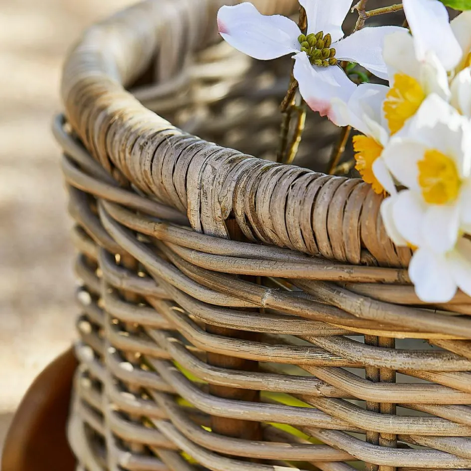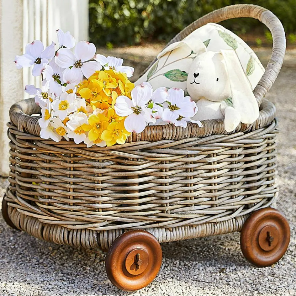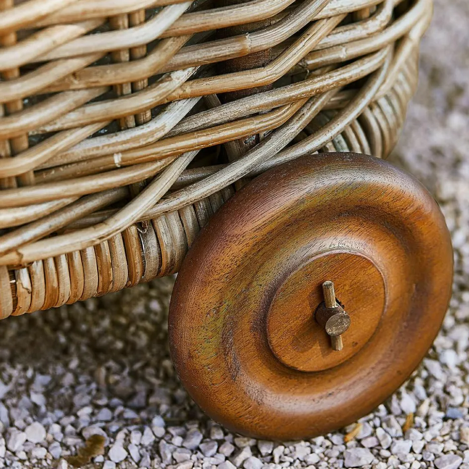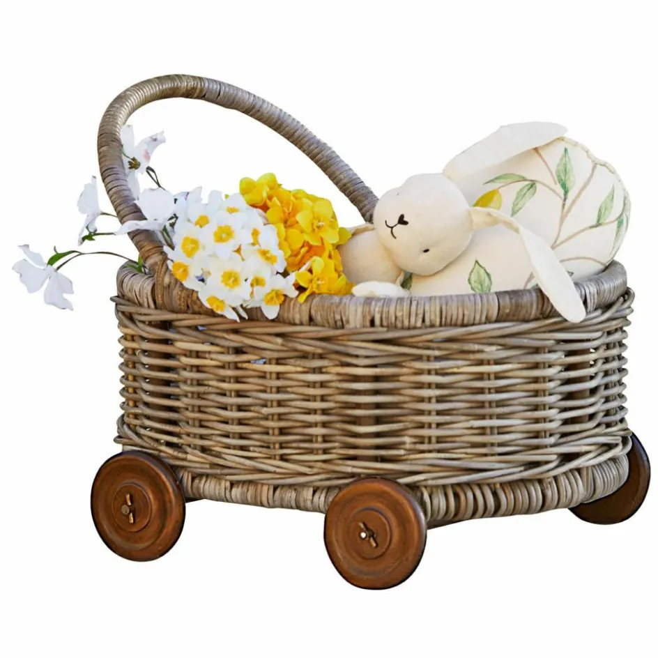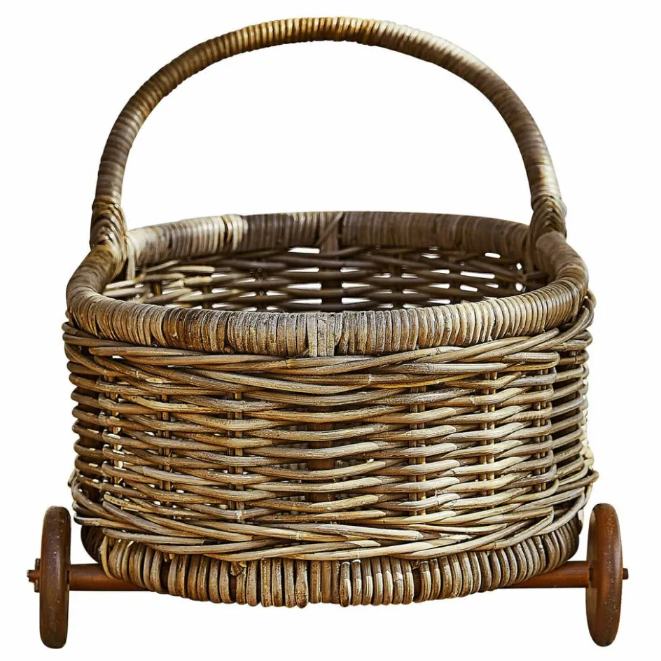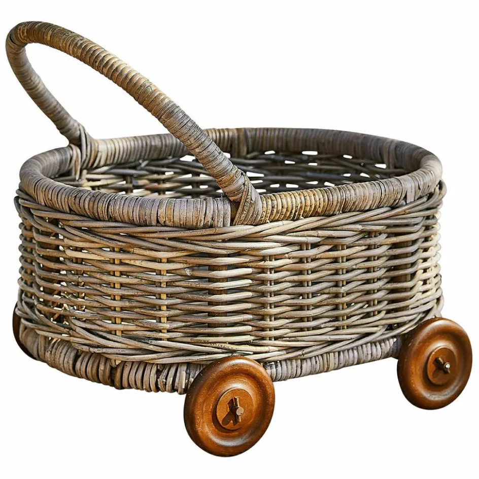 Dieser charmante Rollwagen ist ein echter Blickfang und bringt nicht nur Kinderaugen zum Strahlen. Der aus natürlichem Rattan gefertigte Korb ist mit einem sanften Grau-Finish versehen, das ihm eine moderne Note verleiht. Die handlichen Räder aus edlem Mahagoniholz sind beweglich und leicht zu steuern, sodass kleine Abenteurer ihre Spielsachen bequem umherfahren können. Ob im Kinderzimmer, auf der Terrasse oder im Garten – dieser stilvolle und funktionale Wagen wird schnell zum unverzichtbaren Begleiter. Eine wunderbare Mischung aus traditionellem Handwerk und modernem Design, die Kinder und Eltern gleichermaßen begeistert.