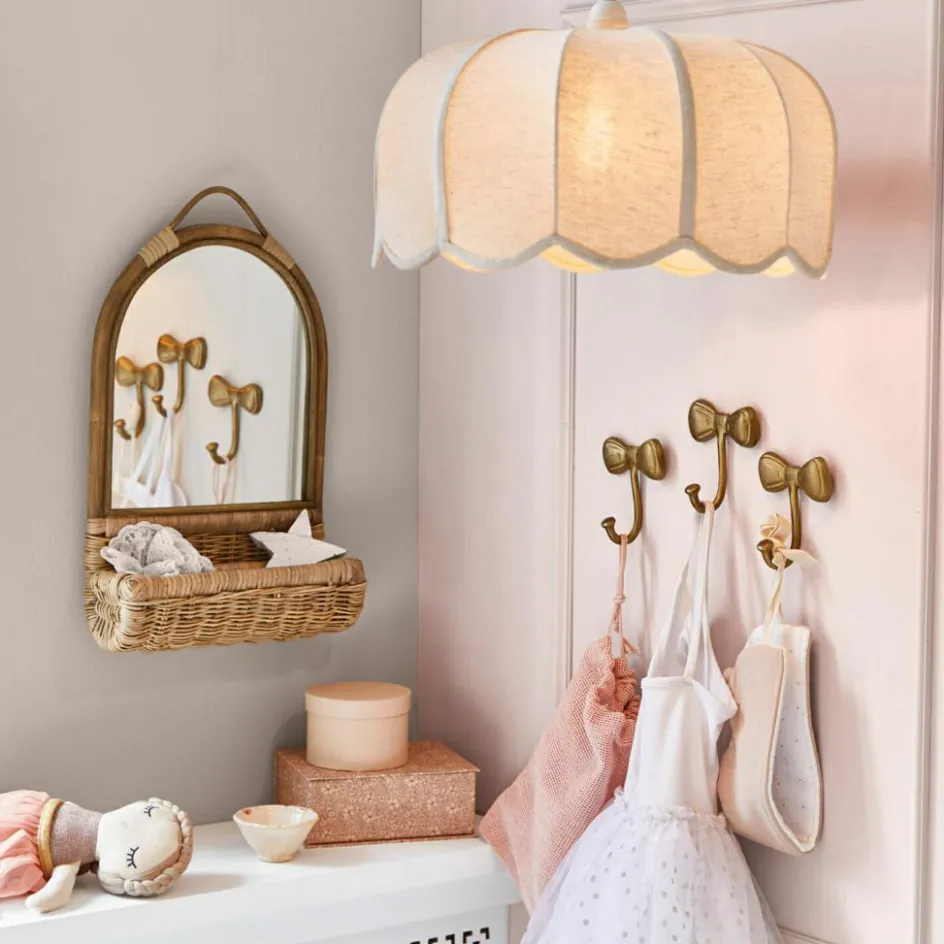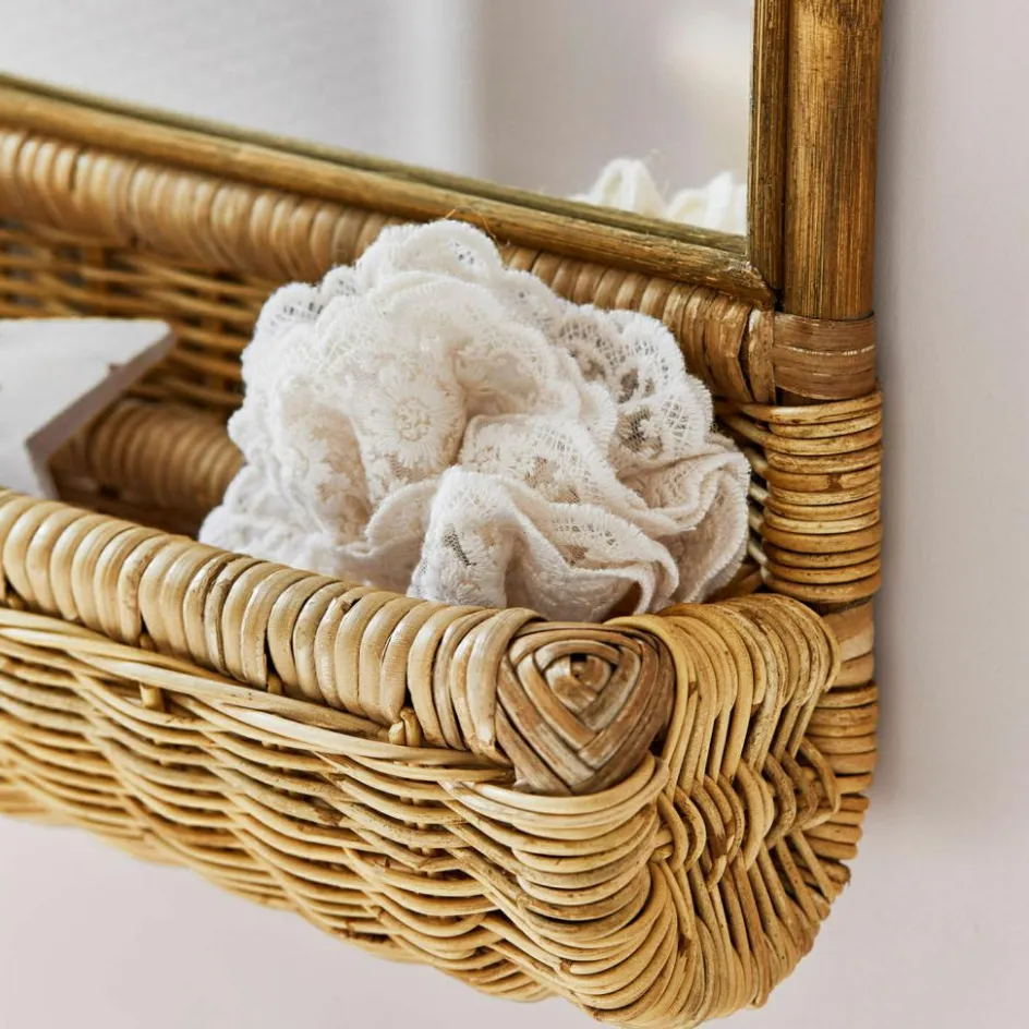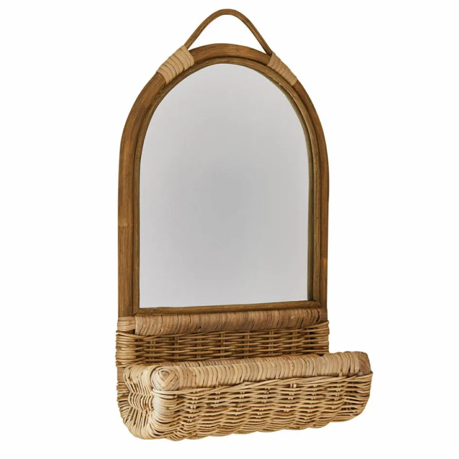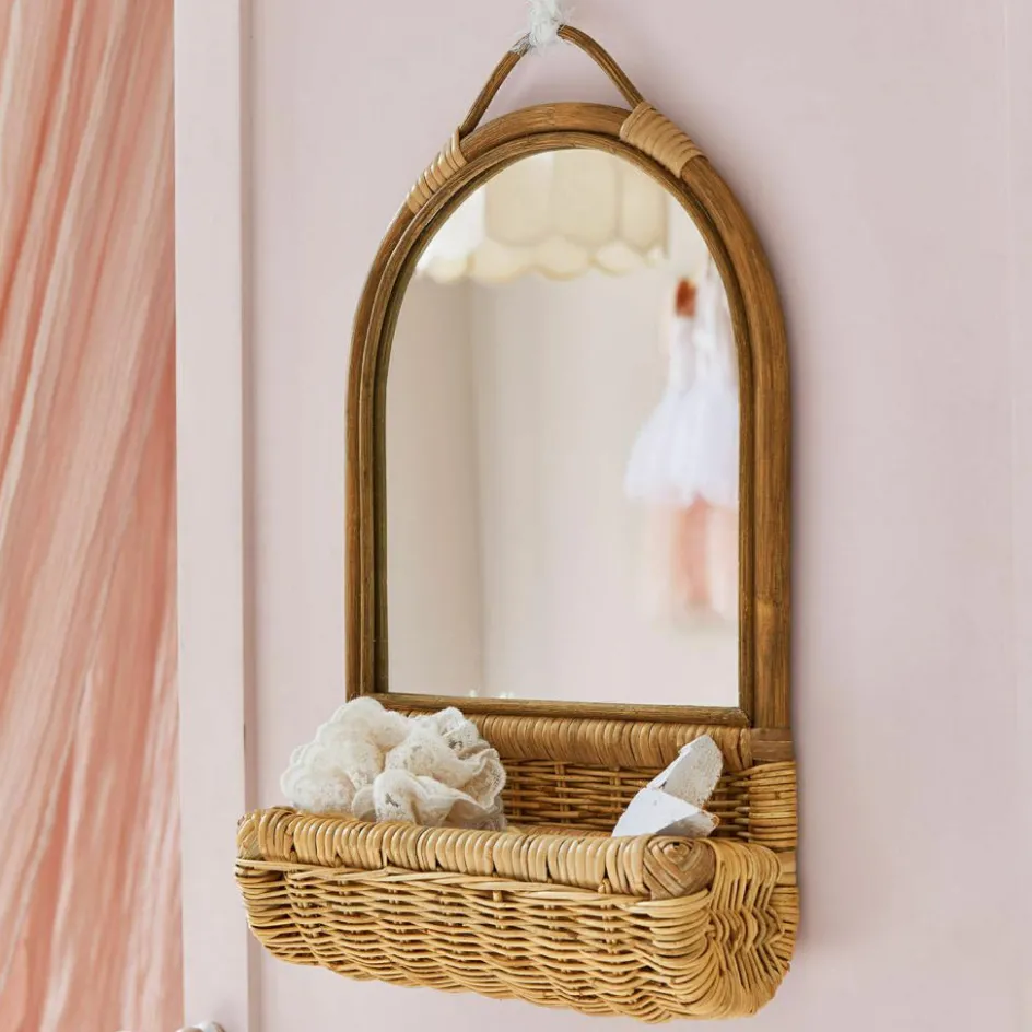 Ein Blick hinein, ein Lächeln zurück: Dieser kindgerechte Spiegel mit Rahmen und Organizer aus naturfarbenem Rattan verbindet verspielten Landhaus-Charme mit durchdachter Funktion. Die weiche Bogenform, das liebevoll geflochtene Muster und die kleine Aufbewahrungskörbchen machen ihn zu einem Highlight über der Kommode oder neben dem Bett. Hier können kleine Dinge ihren Platz finden – ganz ohne großes Chaos. Ob für morgendliche Routinen oder kreative Momente, dieser Spiegel begleitet die Kleinen stilvoll durch den Tag und bringt gleichzeitig Ordnung ins Spiel. Der warme Rattanton harmoniert wunderbar mit natürlichen Materialien und fügt sich mühelos in verschiedenste Kinderzimmer-Stile ein – von nostalgisch bis modern.