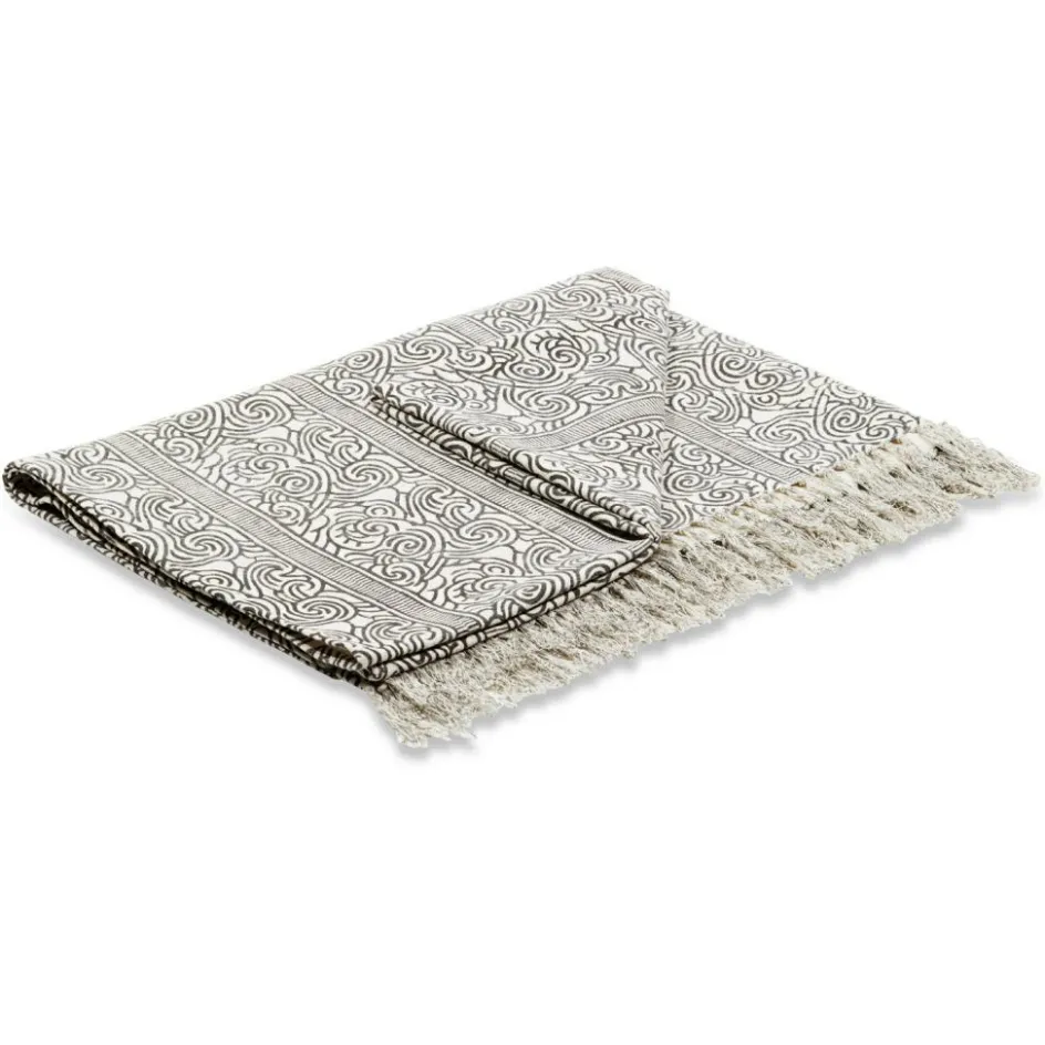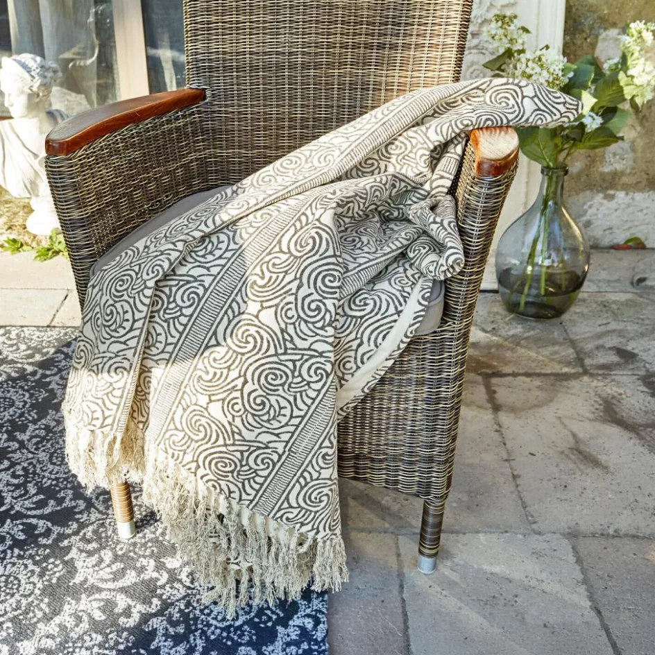 Für ein perfektes Wohlfühl-Ambiente sind wohnliche Textilien wie dieses Plaid unverzichtbar. Ein Print in stilvollem Ornamenten-Muster und eine hochwertige Qualität aus reiner Baumwolle machen es zu einem Lieblingsstück – und zu einem eindrucksvollen Wohnakzent für den französischen Landhaus-Look. Genießen Sie das natürliche Baumwoll-Feeling: Das Gewebe ist weich in der Haptik, atmungsaktiv und sympathisch zur Haut. So verwöhnt Sie die Decke mit bestem Komfort – und das zu jeder Jahreszeit. Dekorative Fransen an den schmalen Kanten runden das Textil ab. Edel in der Farbgebung strahlt das Plaid eine zeitlose Eleganz aus und verträgt sich mit warmen und kühlen Materialien gleichermaßen gut. Auf dem Bett schafft es mit passenden Kissen eine Oase zum Entspannen und Wohlfühlen. Auf dem Sofa macht es relaxte Stunden wunderbar behaglich. Und wenn sich der schöne Sommertag auf der Terrasse langsam dem Ende neigt, hüllen Sie sich gemütlich in die Decke ein und genießen den wunderbaren Moment des Sonnenuntergangs.