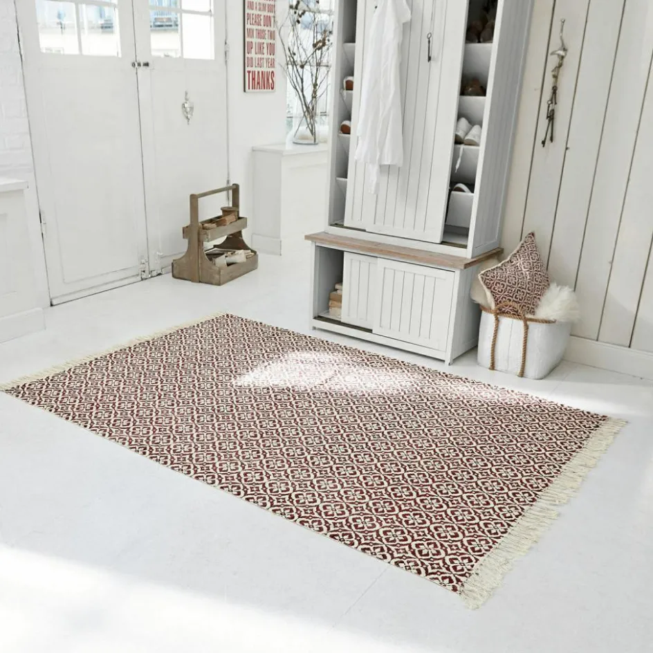 Die Teppichreinigung ist in der Regel eine eher umständliche Angelegenheit, außer es handelt sich um einen Teppich, der tatsächlich für die Maschinenwäsche geeignet ist. Genau das trifft auf unser attraktives Modell zu. Bei 30°C maschinenwaschbar und dazu mit einem besonders eleganten Design ausgestattet. Der Teppich ist aus reiner Baumwolle gewebt und mit einem maurischen Design bedruckt. Aufgrund der hohen Print-Qualität wirken die Muster besonders fein und quasi wie gewebt. Der charmante Fransenabschluss rundet das Design gekonnt ab.