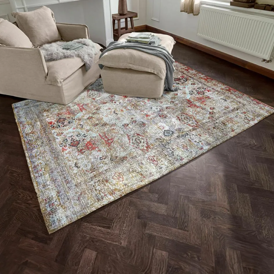 Was wie ein unbezahlbarer Antik-Orientteppich aussieht, der einst die Hallen eines Königs schmückte, ist in Wirklichkeit eine hochwertige Neuinterpretation in authentischer Vintage-Optik. Dabei handelt es sich um ein pflegeleichtes Mischgewebe, denn die Vorderseite besteht aus luftig leichter Viskose, während die Rückseite aus robuster Baumwolle gewebt ist. Das macht den Teppich sehr widerstandsfähig und gleichzeitig angenehm weich. Kurz: eine Freude für Barfußgänger! Die charmante Vintage-Optik ist das Ergebnis eines mehrstufigen Prozesses. Der Teppich wird zuerst gewebt, um seine rustikale Struktur zu erzeugen. Anschließend wird er mit dem bezaubernden Orient-Muster bedruckt. So entsteht der Eindruck einer wunderschönen Antiquität, die über viele Jahre gealtert ist.