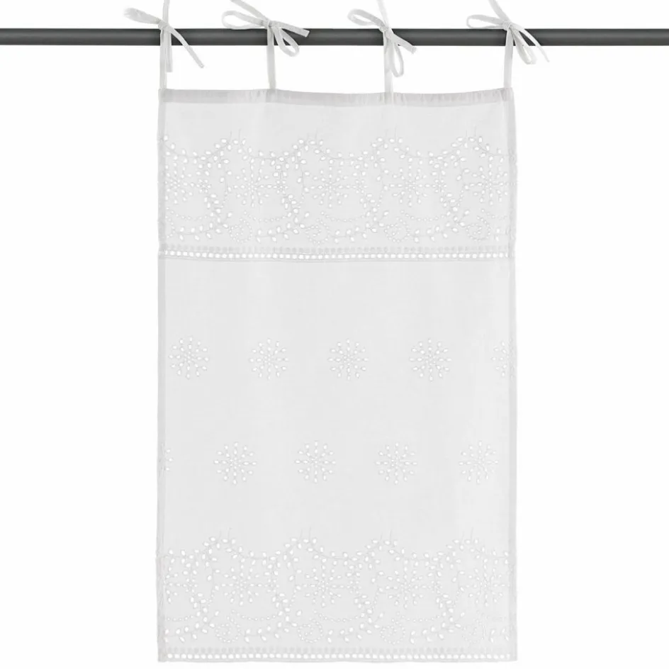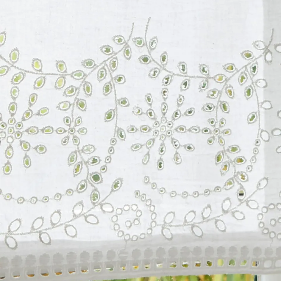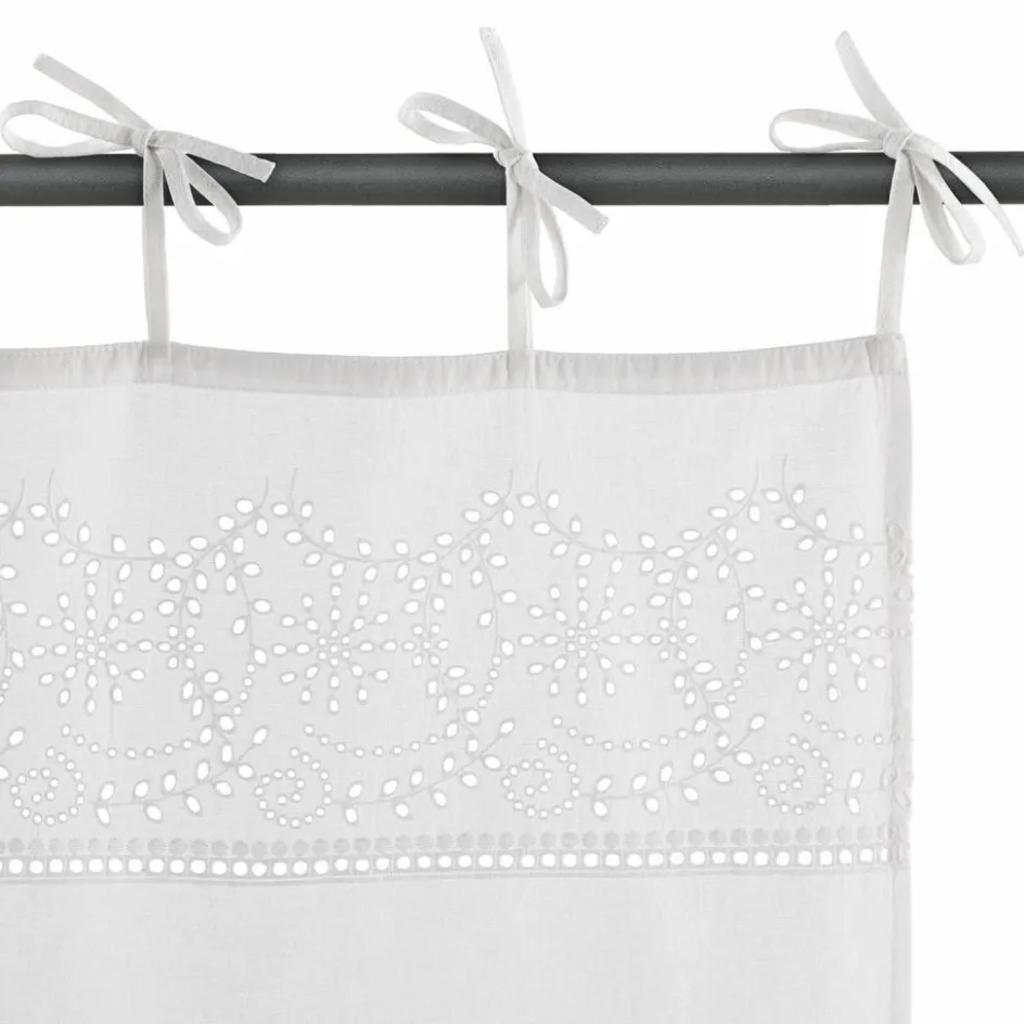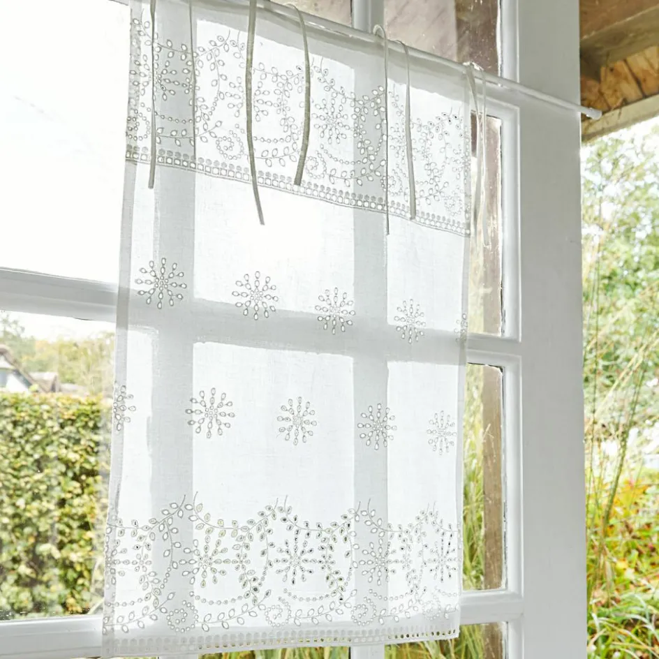Diese Scheibengardine ist ein harmonisches Zusammenspiel aus natürlichen Materialien und filigranem Design. Der Mix aus Baumwolle und Leinen bietet nicht nur eine angenehme Haptik, sondern sorgt auch für eine langlebige Qualität. Die zarte Lochstickerei, die in kunstvollen Mustern das Licht durchscheinen lässt, schafft ein romantisches Flair, das an vergangene Zeiten erinnert. Die praktischen Bindebänder ermöglichen eine flexible und individuelle Aufhängung, die sich perfekt in unterschiedliche Einrichtungsstile einfügt. Ob in der Küche, im Badezimmer oder im Wohnzimmer – diese Gardine bringt Leichtigkeit und einen Hauch Nostalgie in Ihr Zuhause.