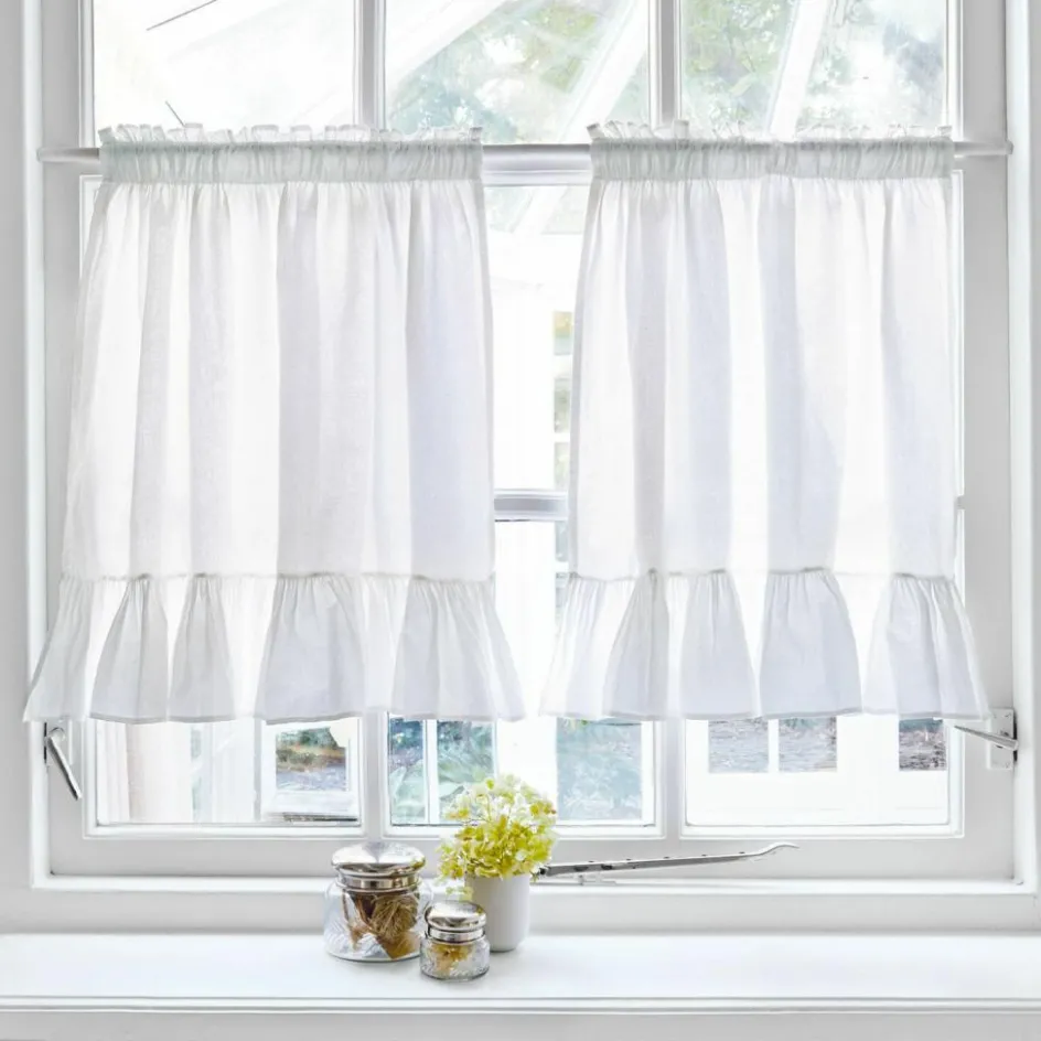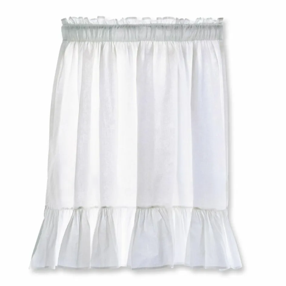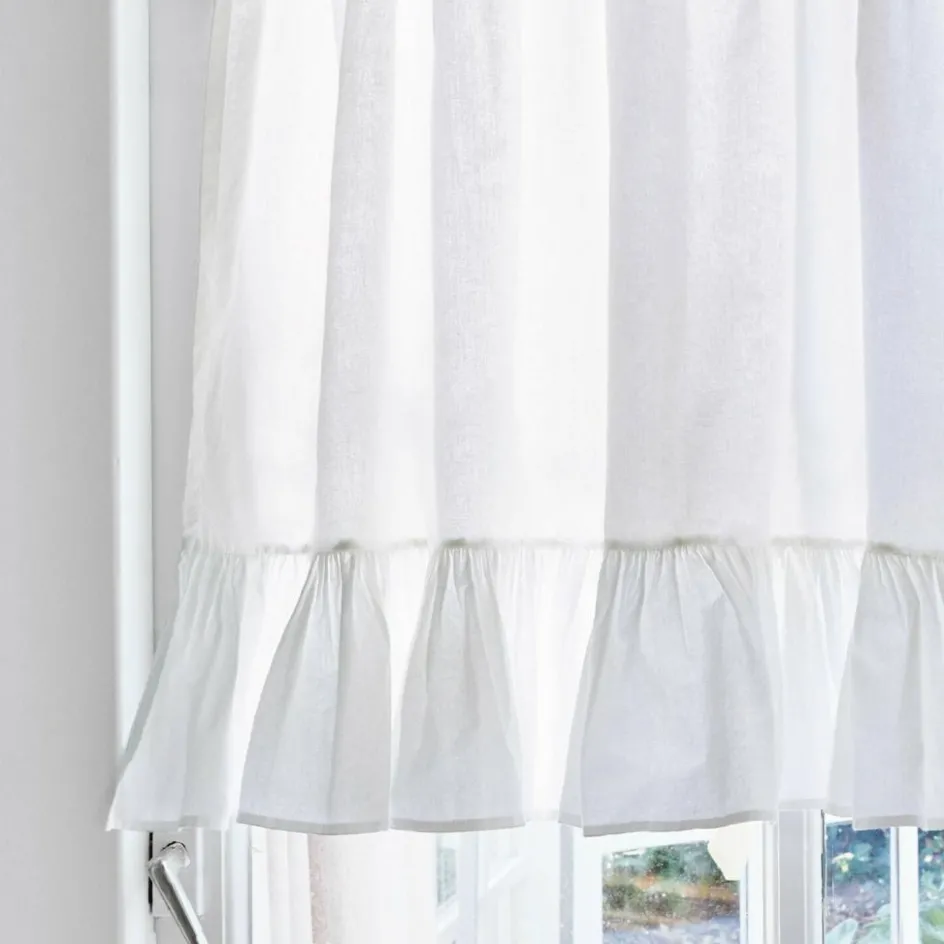 Wenn Sie ein romantisches Wohnambiente lieben, sollten Sie diese Scheibengardine in die Raumgestaltung mit einbeziehen. Sie ist ein hübscher Blickfang und verleiht Ihrem Fenster einen unverwechselbaren Ausdruck, ohne sich in den Vordergrund zu drängen. Dabei setzen verspielte Rüschen am oberen und unteren Saum den schmückenden Akzent. Das natürliche Gewebe aus reiner Baumwolle ist weich fließend und fein genug, um das Tageslicht angenehm mild durchscheinen zu lassen. So bewahrt der Raum seine Helligkeit und Ihre Pflanzen oder besonderen Dekostücke auf dem Fensterbrett erhalten ausreichend Freiraum, um sich wirkungsvoll in Szene zu setzen. Dank einem Tunnelsaum lässt sich das Textil ganz unkompliziert auf die Vorhangstange aufziehen und auf Wunschhöhe am Fenster anbringen. Ein stimmungsvoller Dekoakzent für traumhafte Küchen oder Badezimmer.