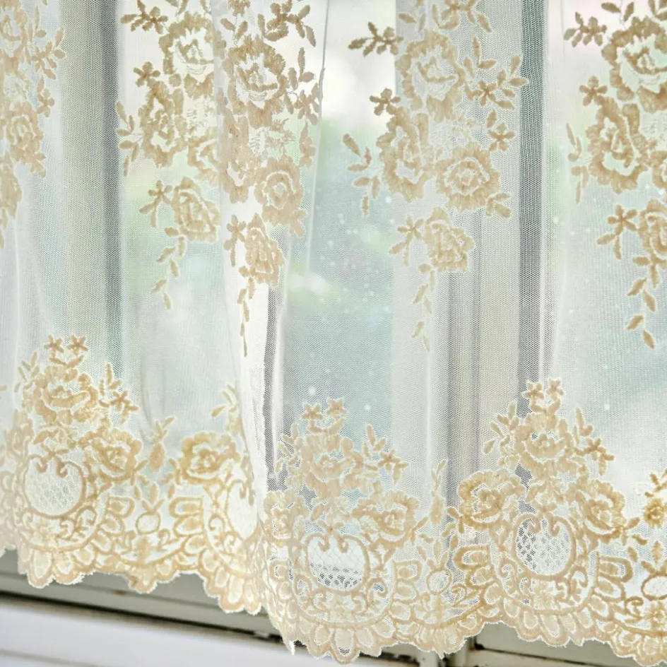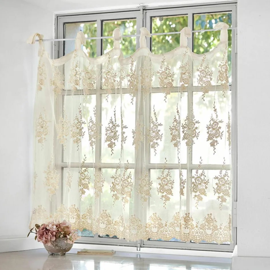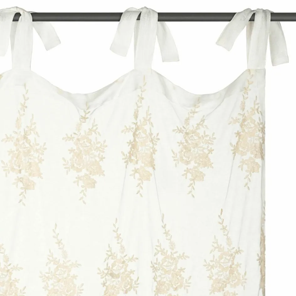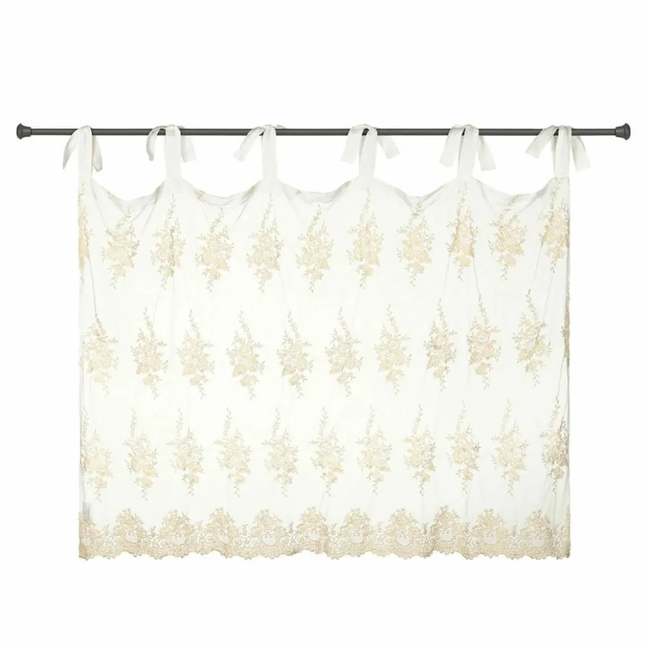 Diese Scheibengardine verwandelt jedes Fenster in ein kleines Kunstwerk. Das zarte Nylonnetz gibt den Blick nach draußen frei und bezaubert zugleich mit detailverliebten Stickereien aus Baumwolle in floralem Design. Der filigrane Look wird durch Bindebänder aus Leinen abgerundet, die nicht nur praktische Flexibilität bieten, sondern auch für einen charmanten, natürlichen Akzent sorgen. Die Kombination aus Transparenz und kunstvoller Verarbeitung verleiht dem Raum eine warme, romantische Atmosphäre. Perfekt für Landhaus-Stil und klassische Interieurs.
