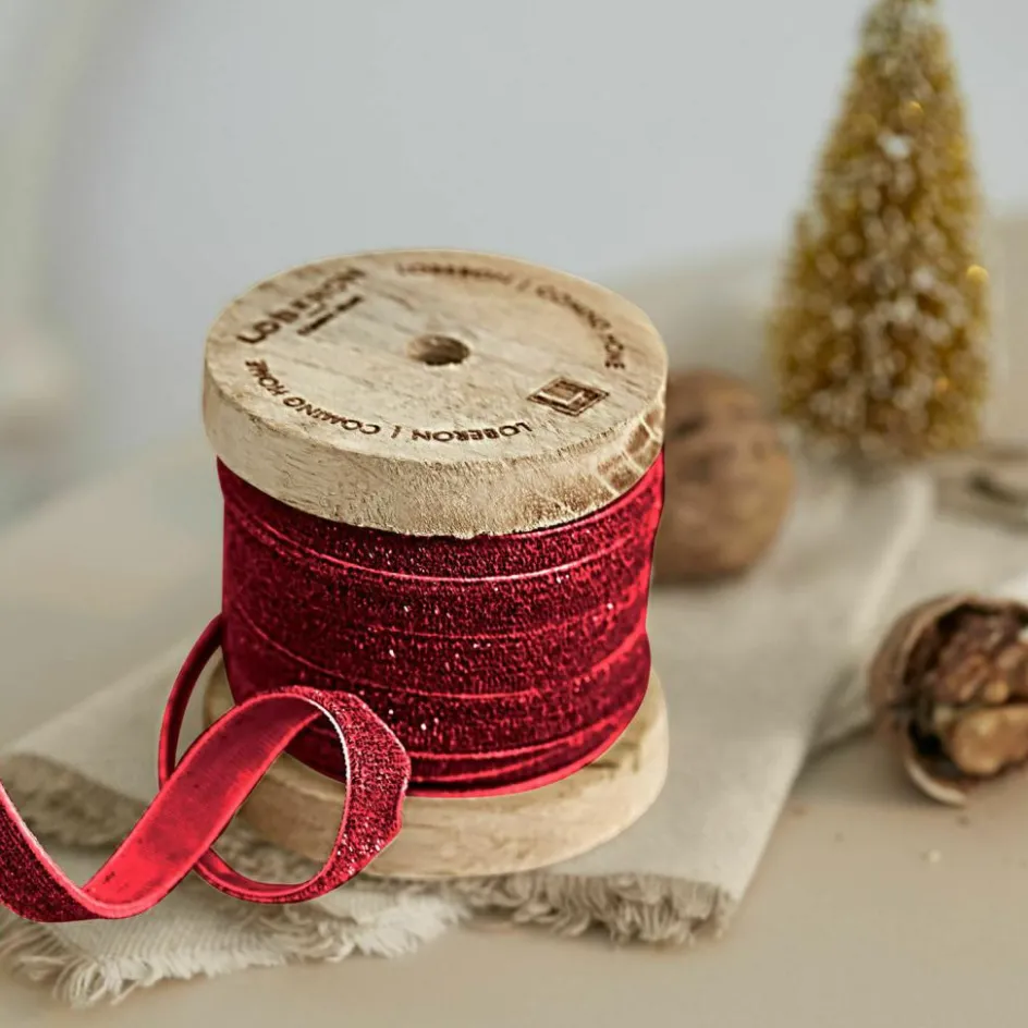 Tauchen Sie ein in die Welt luxuriöser Dekorationen mit diesem exquisiten Samtband. Der samtartige Stoff schmeichelt Ihren Fingerspitzen, während der zarte Glitzer funkelnde Akzente setzt und für ein faszinierendes Spiel mit dem Licht sorgt. Aufgewickelt auf einer rustikalen Spule aus massivem Mangoholz, vereint dieses Band Funktionalität mit ästhetischem Genuss. Die Kombination aus der natürlichen Textur des Holzes und dem eleganten Schimmer des Bandes schafft eine harmonische Einheit, die jede kreative Arbeit veredelt. Mit einer Breite von 1 cm und einer Länge von 10 Metern bietet es reichlich Spielraum für Ihre kreativen Ideen. Ob als edles Geschenkband, funkelndes Detail in festlichen Dekorationen oder glamouröses Accessoire bei besonderen Anlässen – dieses Band verleiht allem eine zauberhafte Eleganz.