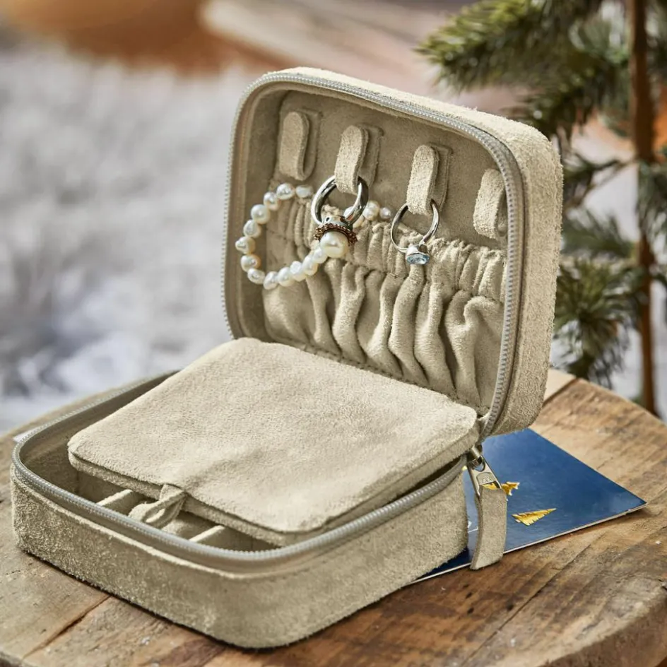 Dieses sehr schöne Schmuckkästchen bezaubert mit seinem eleganten Design aus echtem Büffel-Veloursleder. Innen ist es mit Polyester ausgekleidet. Das stilvolle und klassische Accessoire schützt und sortiert Ihren Schmuck perfekt, denn es hat viele kleine Fächer und eine extra Aufbewahrung für Ringe. Hier haben Sie ein hübsches Plätzchen für Ihren Lieblingsschmuck gefunden, was auf Reisen oder auch zu Hause eine große Hilfe ist. Das Design erinnert an mondäne, frühere Zeiten und bringt auch gleich mehr Ordnung in Ihr Zuhause und Ihren Reisekoffer.