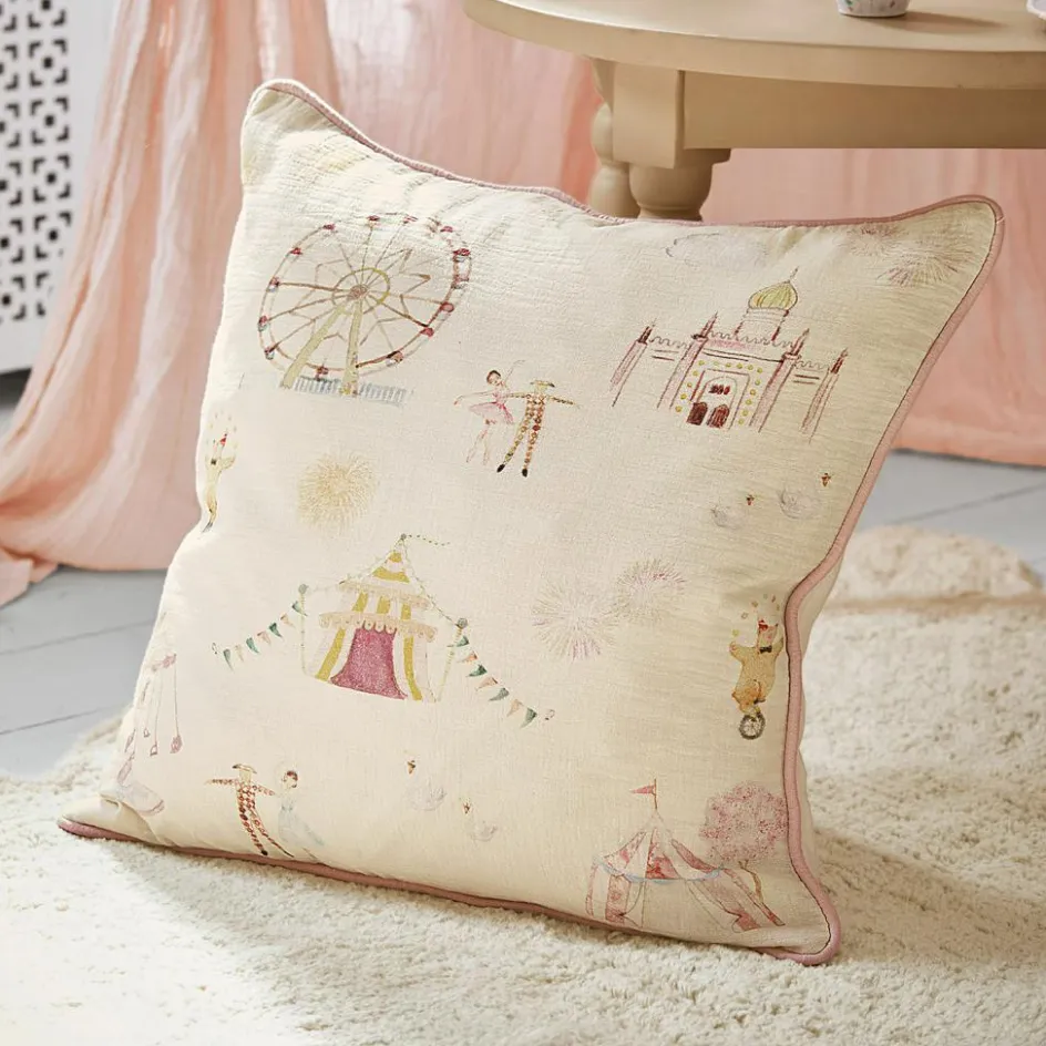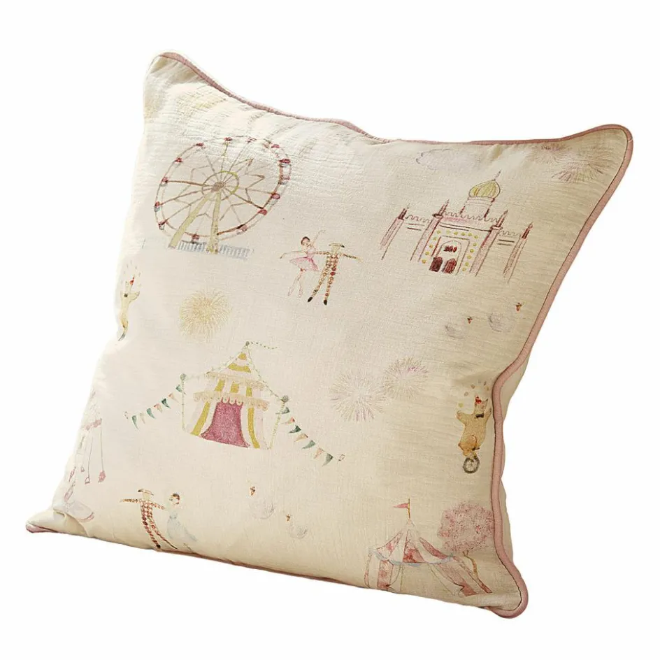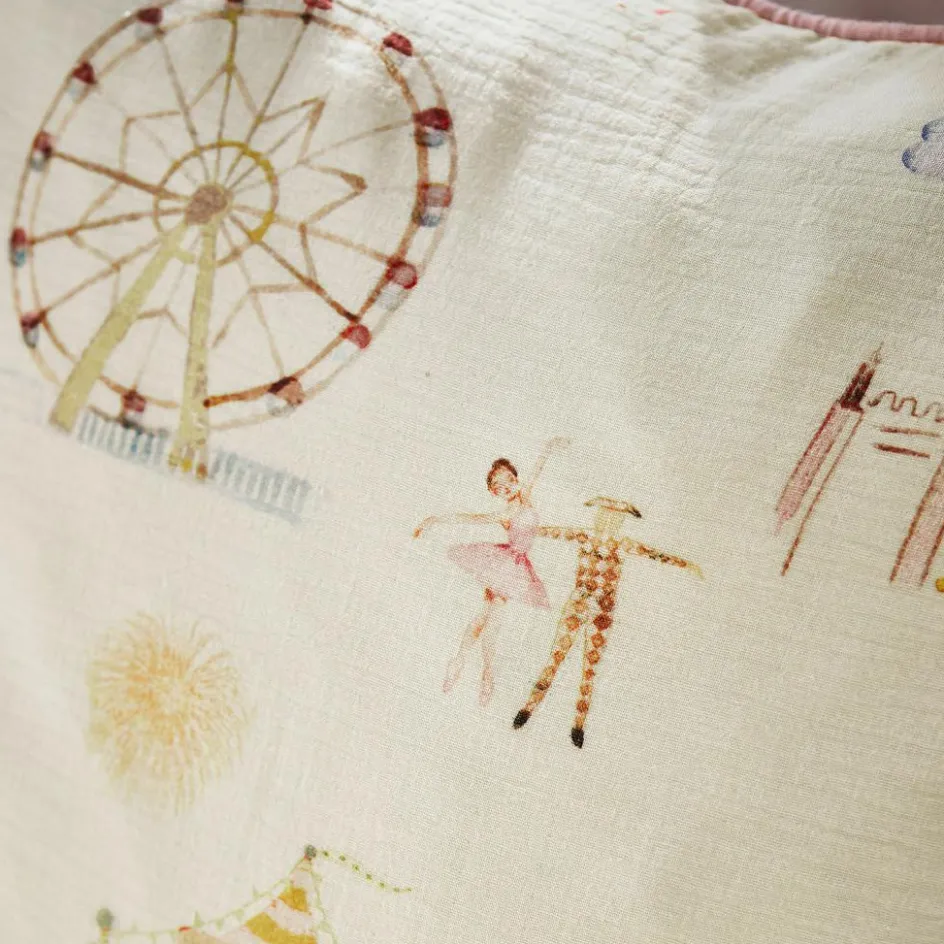 Zirkusluft liegt in der Luft! Diese Kissenhülle aus herrlich weichem Musselin entführt in eine verspielte Fantasiewelt voller Zuckerwattewolken, Artisten in schwindelerregender Höhe und fröhlich drehender Karussells. Der detailverliebte Druck zeigt eine nostalgisch angehauchte Szenerie mit Jahrmarktstimmung, in sanften Aquarelltönen gehalten – malerisch, ohne aufdringlich zu sein. Umrahmt wird das textile Kunstwerk von einem zarten, rosa eingefassten Rand, der dem Ganzen eine liebevolle Kontur verleiht. Ob als Hingucker auf dem Bett oder als Kuschelbegleiter auf der Couch: Dieses Kissen bringt kindliche Fantasie und Wärme in jedes Zimmer.