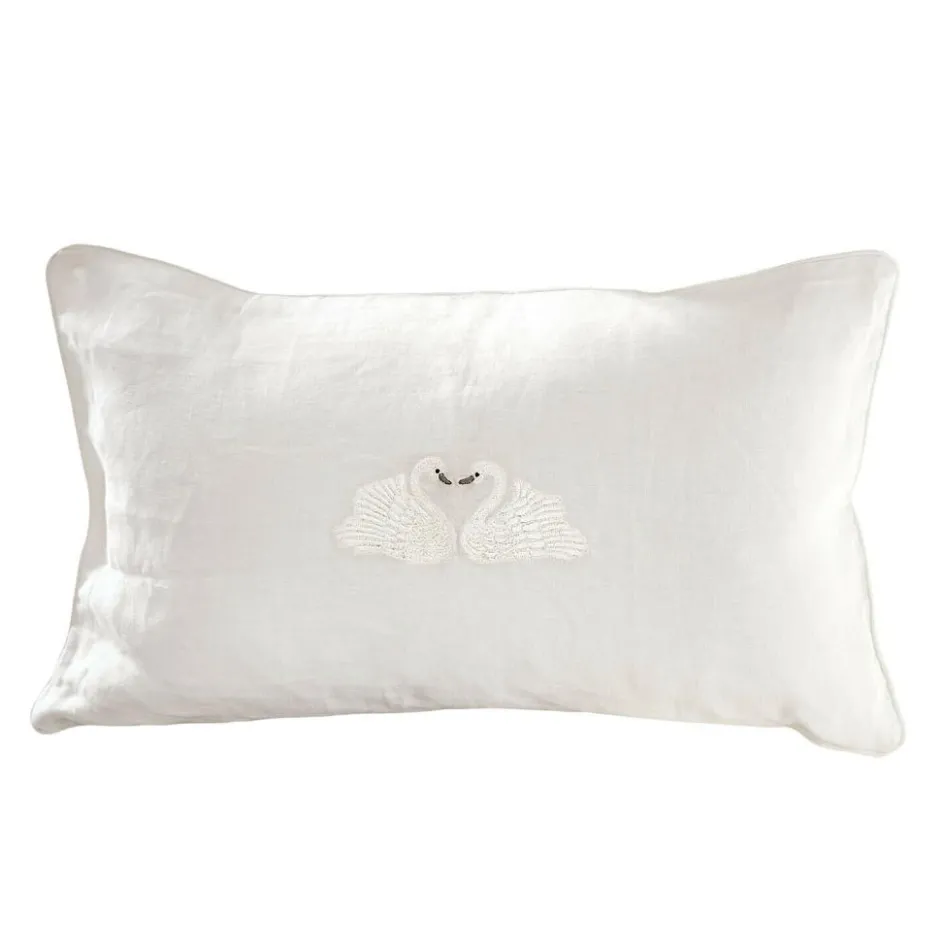 Wie ein leiser Gruß aus einer friedlichen Traumwelt wirkt diese Kissenhülle aus reinem Leinen. Ihre Oberfläche zeigt die typische, leicht unregelmäßige Struktur des Naturmaterials – lebendig, angenehm griffig und voller Charakter. In der Mitte treffen sich zwei anmutige Schwäne, die in feinem Stickgarn ausgearbeitet sind und eine Szene der stillen Zärtlichkeit bilden. Die sanfte Paspelierung entlang der Kanten verleiht dem Design eine klare Form und sorgt für ein liebevoll abgeschlossenes Gesamtbild. Ob im Kinderzimmer, auf dem Lieblingssessel oder als charmantes Detail auf dem Sofa – diese Hülle verleiht jedem Raum einen Hauch stiller Poesie.