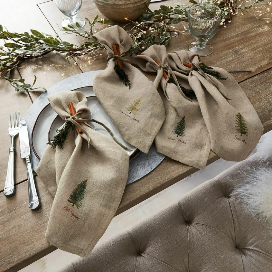Das i-Tüpfelchen auf Ihrer festlich geschmückten Weihnachtstafel werden diese hübschen Servietten sein, die wir Ihnen gleich im praktischen 4er Set anbieten. Sie sind aus einem feinen, hochwertigen Leinengewebe und jede ist mit einem anderen nostalgischen Tannenbaum-Motiv bedruckt. Ob zum adventlichen Kaffeeklatsch mit Freunden oder zum großen Festessen am Weihnachtstag mit der ganzen Familie – mit diesen Servietten machen Sie Ihre Tafel perfekt. Tipp: Die Servietten lassen sich nicht nur mit klassischen Serviettenringen dekorieren, Sie können den weihnachtlichen Charakter auch mit einem Band und je einem kleinen Tannenzapfen betonen. Natürlich ist das Servietten-Quartett waschbar und immer wieder einsetzbar, also auch umweltfreundlich.