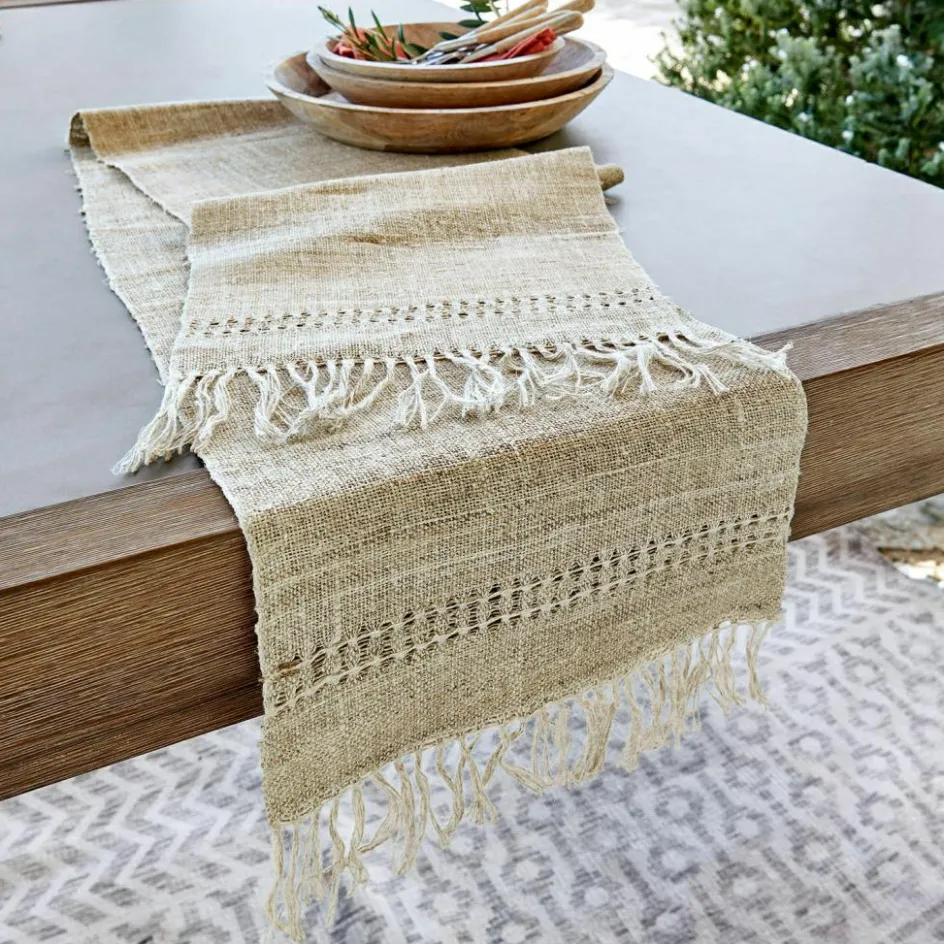 Pure Natur wurde für diesen edlen Tischläufer von Hand verarbeitet. Die Textil-Designer lieben das Naturmaterial Hanf, weil es mit seinem charakteristischen Melange-Effekt nicht nur edel aussieht, sondern auch strapazierfähig und langlebig ist. Das eingewebte Durchbruchmuster und dekorative Fransen an den Schmalseiten setzen einen hübschen Akzent. Der Läufer passt hervorragend zum Natural Living-Trend – mit seinem etwas gröberen Charakter harmoniert er ideal mit rustikalen Holztischen und Steinzeug-Geschirr. Durch seine Größe ist er für lange Tische perfekt und lässt sich auch für festliche Gästetafeln einsetzen. So schön und vielseitig kann Nachhaltigkeit sein.