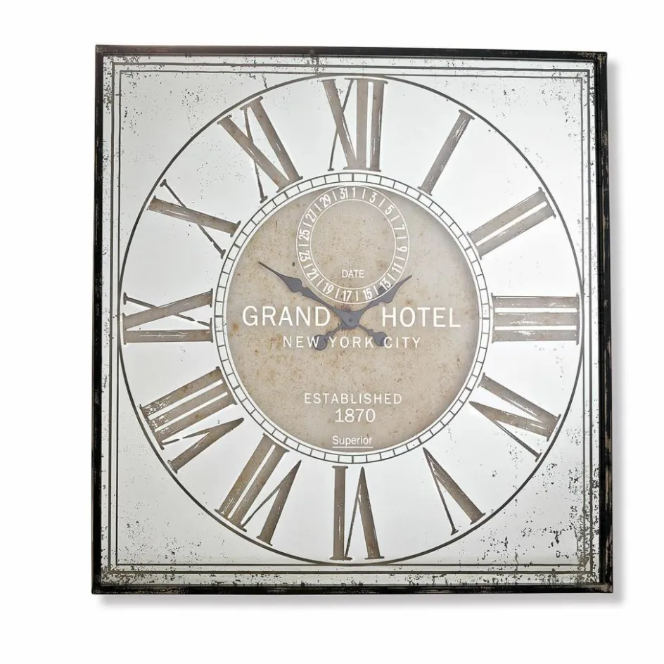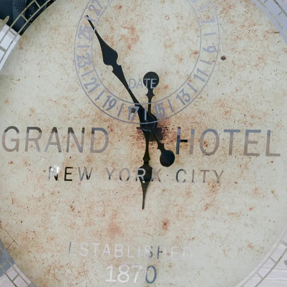 Wie mag wohl das Tagesgeschäft dieser eleganten Uhr ausgesehen haben, die offensichtlich auf ein langes Vorleben zurückblicken kann? Zierte sie vielleicht die Wand hinter der Rezeption im Grand Hotel von New York, wie es der Schriftzug vermuten lässt? Durfte sie dort tagein, tagaus den elegant und nach der neuesten Mode gekleideten Gästen die Zeit anzeigen? Und wie viele der typischen Schrankkoffer wurden wohl unter ihrer Aufsicht von den Pagen durch die von Säulen gesäumte Eingangshalle geschoben? Lassen Sie mit dieser exklusiv wirkenden Uhr, bei der kunstvoll gestaltete Zeiger und römische Ziffern die Uhrzeit kommunizieren, das Flair längst vergangener Zeiten in Ihren Räumen einziehen. Das antike Finish, der schmale Eisenrahmen und das hochwertig verspiegelte Frontglas verleihen ihr das stilechte Aussehen, mit dem sich die Uhr in Ihrem Wohnzimmer so gut machen wird wie im Flur oder über der Anrichte im Esszimmer. Sie komplettiert Interieurs im Landhaus-Stil so perfekt wie sie sich in Einrichtungen mit Vintage-Charme oder Shabby-Chic einfügt. Hinter ihrer geschichtsträchtigen Fassade tickt natürlich ein modernes Quarzwerk und zur einfachen Befestigung an der Wand befinden sich hinten zwei Aussparungen.