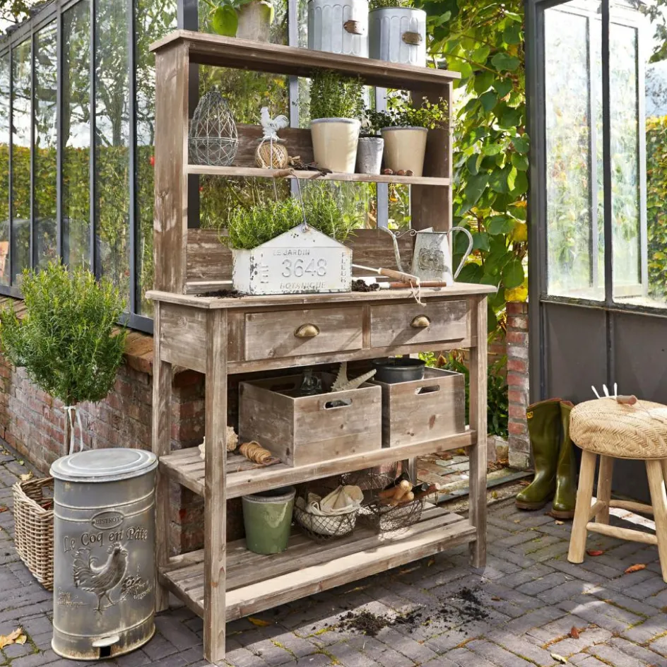 Als dekorativ und praktisch zugleich entpuppt sich dieser Pflanztisch aus handbearbeitetem Holz. Das Outdoor-Möbel mit Antik-Lasur bietet zudem auf kleiner Fläche jede Menge Stauraum und ausreichend Arbeitsfläche zum Umtopfen und Pflegen kleinerer Pflanzen. Insgesamt vier Ablageböden, zwei Schubladen und zwei herausnehmbare Holzkisten helfen derweil beim Ordnung halten und effektivem Arbeiten. Ein Tipp: Damit Sie möglichst lange Freude an dem hölzernen Pflanztisch mit natürlichem Charme haben, stellen Sie ihn etwas geschützter auf – das schöne Tannenholz verträgt auf Dauer keinen direkten Regen oder zehrende Wochen unter einer Schneehaube. Eine andere Idee: Eine Abdeckplane für Gartenmöbel umfunktionieren – klein genug ist der Pflanztisch dafür allemal.