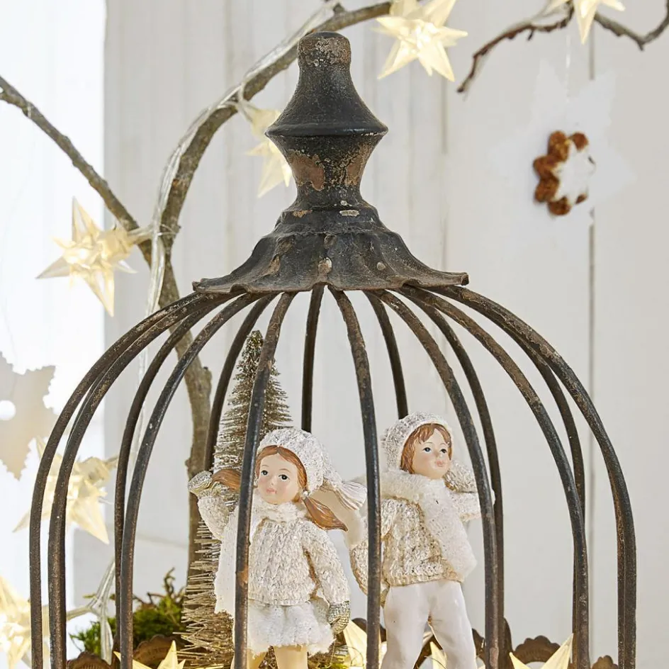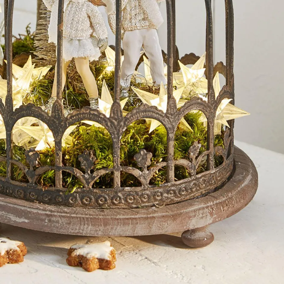 Ein wunderschönes Schmuckstück im stilvollen Shabby-Chic. Das edle Design besteht aus einer reich verzierten, romantischen Glocke aus Eisen. Sie ist abnehmbar und ruht auf einem Tablett aus Tannenholz. Ein Antik-Finish sorgt für eine schöne Patina und lässt das hübsche Stück wie aus früheren Zeiten erscheinen. Dazu harmonieren die zwei doch gegensetzlichen Materialien besonders hübsch miteinander. Perfekt für alle, die die Nostalgie lieben und einen zeitlosen Akzent setzen wollen. Lassen Sie das stilvolle Modell ganz pur wirken oder schmücken Sie es kreativ – saisonal sind hier immer wieder neue Kreationen möglich. Teelichter, Federn, edle Steine, Blumen und viele andere Lieblingsstücke lassen sich unter der Glocke kunstvoll arrangieren. Im Sommer könnten Muscheln ein Plätzchen darunter finden, im Herbst Mini-Kürbisse und im Winter Tannenzapfen und Lichterketten.