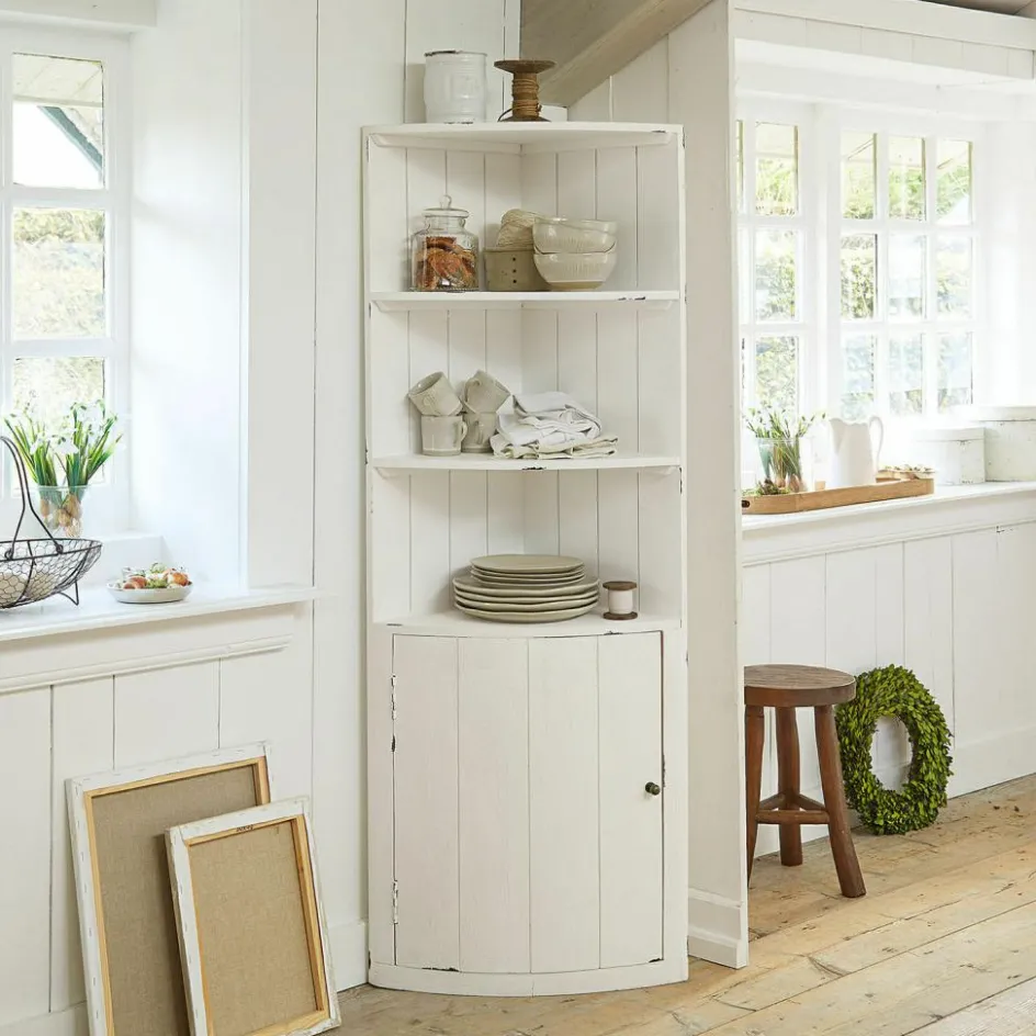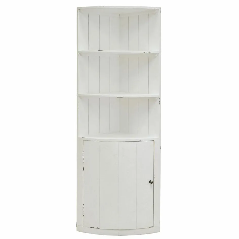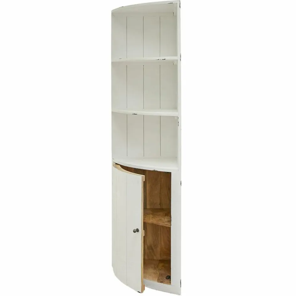 Das Eckregal strahlt ländliche Gemütlichkeit aus und bringt mit seinem Antikweiß-Finish nostalgisches Flair in Ihr Zuhause. Die formschöne Struktur aus stabilem Holz bietet Platz für Ihre Lieblingsdeko, Bücher oder Alltagsgegenstände. Hinter der dekorativen Tür verbirgt sich zusätzlicher Stauraum, perfekt für Dinge, die Sie aus dem Blickfeld halten möchten. Schön ist der Blick ins Innere dennoch, da das Holz an dieser Stelle ganz natürlich belassen wurde und mit einem schönen, fast dunklem Braun einen hübschen Kontrast ergibt. Durch das clevere, platzsparende Design fügt es sich mühelos in jede Ecke ein und bringt auf charmante Weise Ordnung in Ihre Räume. Die kleinen Details, wie der runde Metallknauf an der Tür, verleihen dem Möbelstück einen liebevollen Vintage-Touch.