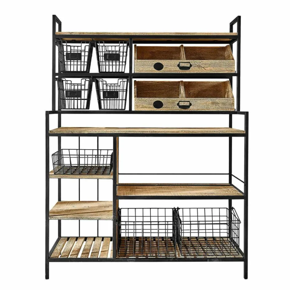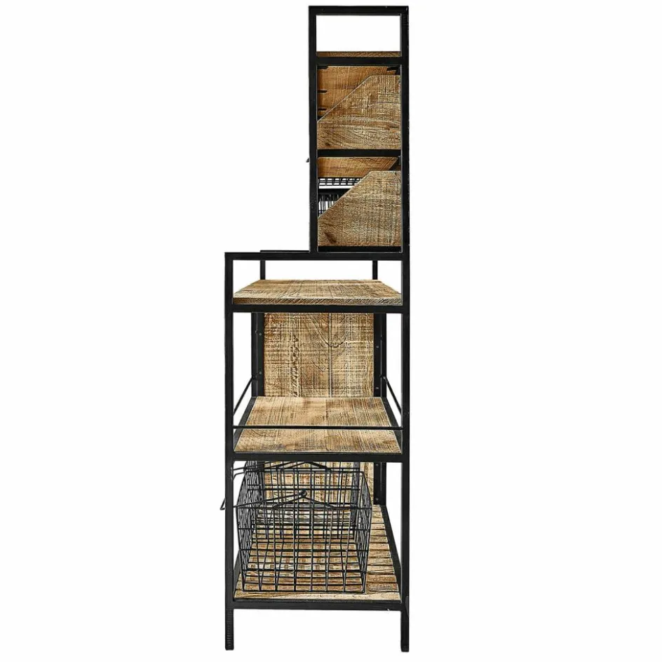 Dieses Regal bringt den Charme des Industrial-Stils in Ihr Zuhause und überzeugt mit seiner durchdachten Funktionalität. Der robuste Rahmen aus Eisen trifft auf die warme Ausstrahlung von massivem Mangoholz, was einen spannenden Kontrast schafft. Zwei Schubladen mit integrierten Tafelflächen, sowie Einsteckplätze für Kärtchen ermöglichen eine individuelle Beschriftung – perfekt, um Ordnung zu halten. Ergänzt wird das Design durch praktische Körbeinsätze und großzügige Ablageflächen, die ausreichend Platz für Utensilien, Vorräte oder dekorative Elemente bieten. Ob im Hauswirtschaftsraum, in der Küche oder im Arbeitszimmer – dieses Regal ist ein echter Alltagsheld, der gleichzeitig Ihre Einrichtung bereichert.