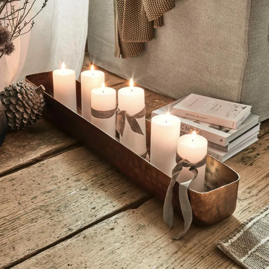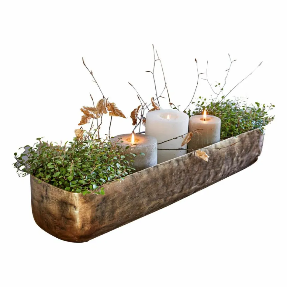 So schön ist nur Kerzenlicht: Der flackernde Feuerschein spiegelt sich bei diesem Schmuckstück in der glänzenden Oberfläche und sorgt für schimmernde Effekte. Die faszinierende Schale unterstreicht in romantischen Nächten nicht nur die traumhafte Stimmung, sondern hebt auch die Objekte in wundervoller Weise hervor. Ob Kerzen, Metallkugeln oder andere Stücke, in diesem formvollendeten Gegenstand wirkt alles ganz zauberhaft. Die Schale ist komplett aus Aluminium gegossen. Durch das besondere Herstellungsverfahren besticht sie mit einer rauen und unebenen Oberfläche, auf der sich das Kerzenlicht in märchenhafter Weise verfängt. Durch ein einzigartiges Finish, erhält jede einzelne Schale einen ganz besonderen Look. So wird jedes Stück zu einem Unikat, das in immer leicht veränderten Farben schimmert. Das dezente Antikmessing passt zu vielen Einrichtungsstilen und lässt die Dekoration glänzen. Kerzen oder andere Deko-Objekte sind nicht im Lieferumfang enthalten. Setzen Sie die Schale ganz nach Ihrem Geschmack in Szene, nach Jahreszeit oder Saison – zum Beispiel mit frühlingshaften Blüten oder weihnachtlich mit Kerzen. Lebensmittel können nicht in der Schale aufbewahrt werden, dafür macht sich andere Deko ganz zauberhaft in ihr.