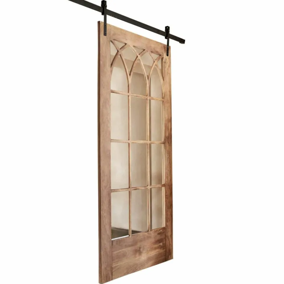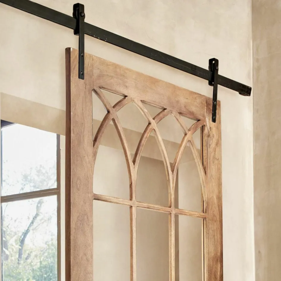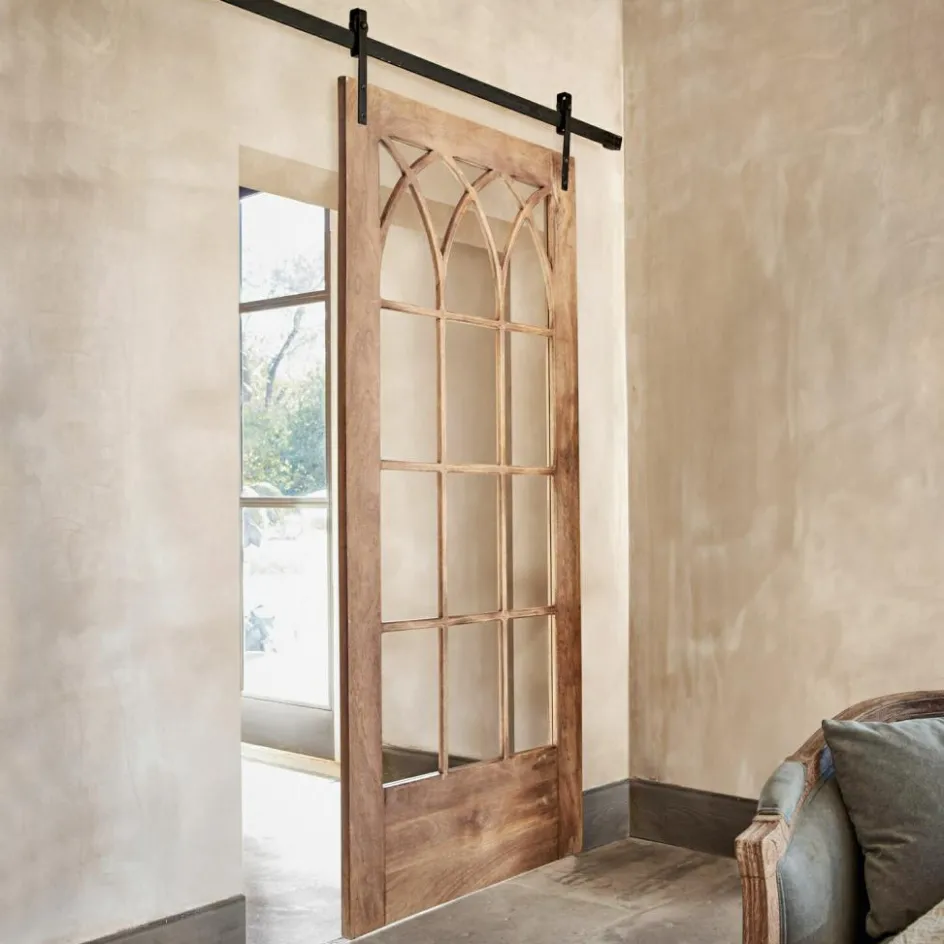 Das stilvolle Zusammenspiel aus edlem Holz und kunstvollen Verarbeitungsdetails erinnert an die klassischen Vitrinenschränke, ohne die früher kein Wohn- oder Speisezimmer auskam. Von Kopf bis Fuß diesen antiken Vorbildern folgend sind auch bei dieser Schiebetür massives Mangoholz und hochwertiges Klarglas die beiden Komponenten, die ihr den unverwechselbaren Look geben. Jedes Detail lässt die Liebe des Künstlers zu seiner Profession und dem Naturmaterial Holz erkennen, das sich auf dem großzügigen Rahmen und der Aufhängung der Schiebetür in seiner natürlichen Schönheit und mit seiner lebendigen Maserung zeigen darf. Bei den Sprossen vor der Glasfläche aber demonstrierte der Künstler sein ganzes Können und kombinierte klassisch strenge mit elegant geschwungenen Elementen, die der Schiebetür eine optische Leichtigkeit verleihen. Ob Sie den Essbereich vom Wohnraum oder das Schlafzimmer vom Ankleideraum oder die Küche vom Esszimmer trennen möchten – mit dieser Schiebetür wird Ihnen das auf stilvolle Weise gelingen. Auch für den Übergang vom Hauseingangsbereich in den Wohntrakt eignet sich die Schiebtür hervorragend und stimmt gleich auf das exklusive Ambiente ein, das alle Eintretenden im Inneren erwartet. Die stabile und leichtgängige Schiebevorrichtung aus Eisen ist im Lieferumfang inbegriffen.