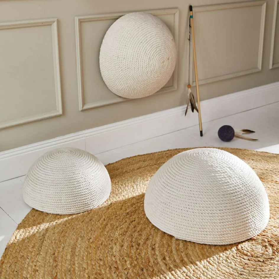 Wie kleine Kunstwerke schmiegen sich die drei halbrunden Elemente an die Wand – doch ihr Zweck ist alles andere als rein dekorativ. Dieses Kratzornament-Set verwandelt freie Wandflächen in ein Abenteuerrevier für Ihre Katze. Ein wunderschöner wie praktischer Catwalk! Das strukturreiche Baumwollseil auf massivem Mangoholz bietet eine ideale Fläche zum Klettern, Springen und Krallenwetzen – ganz ohne Platz auf dem Boden zu beanspruchen. Dank der natürlichen Farbgebung harmonieren die Kletterelemente mit nahezu jedem Wohnstil – von urbanem Loft-Flair bis zum gemütlichen Landhaus. Ihre Katze wird es lieben, sich an den robusten Halbkugeln entlang zu hangeln – und Sie werden sich über ein charmantes Wandobjekt freuen, das Funktion und Ästhetik mühelos vereint. Befestigt werden die Ornamente mit je an zwei Schlüssellochaufhängungen.
