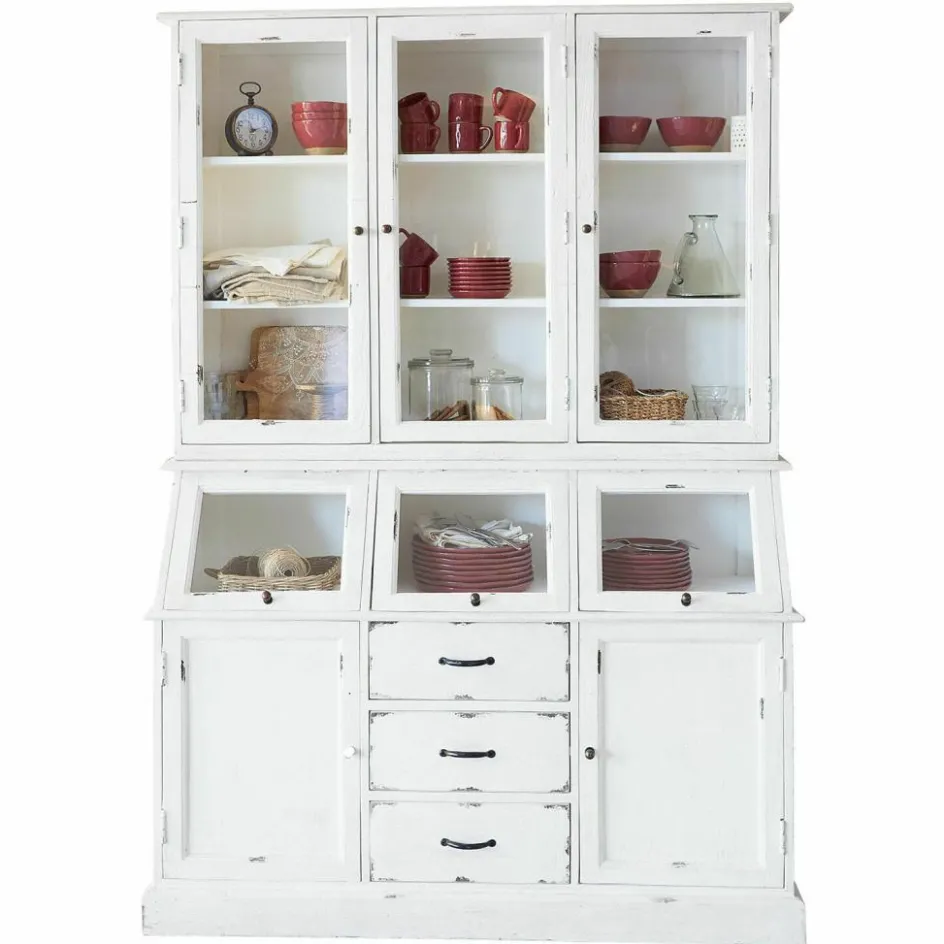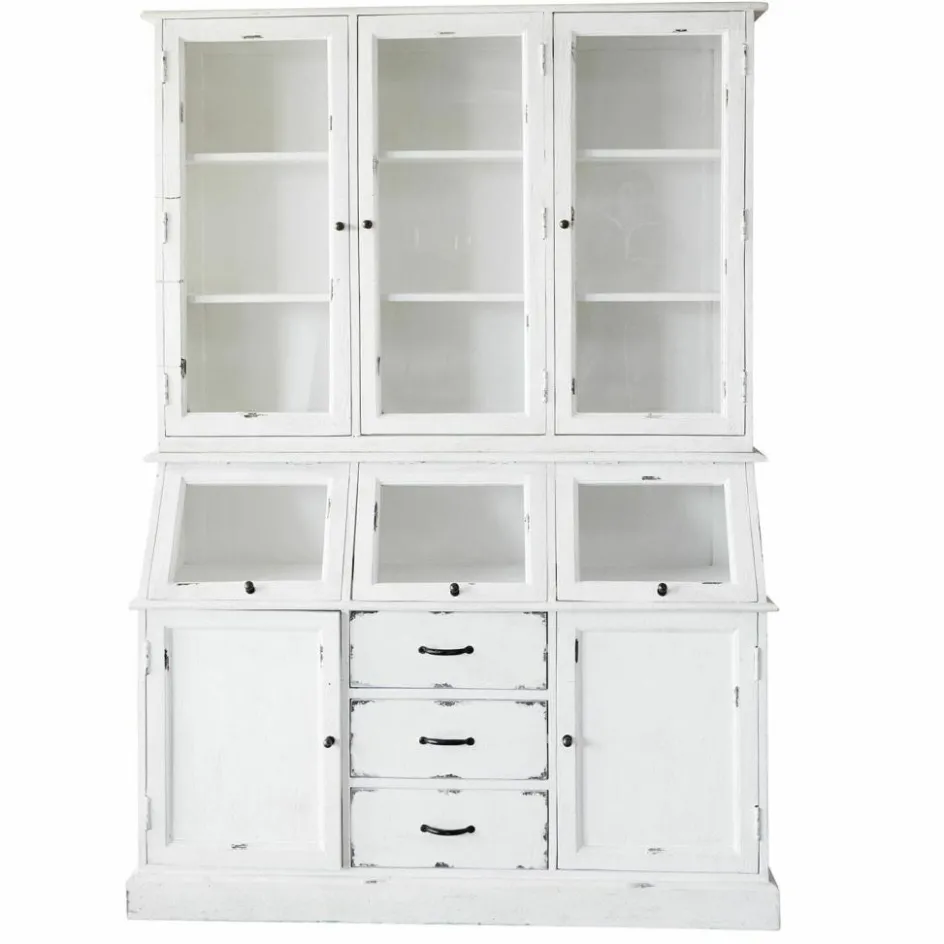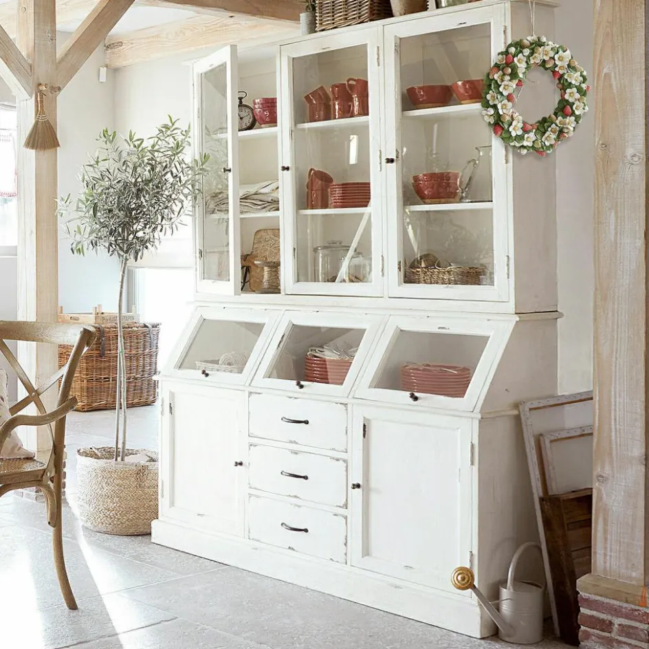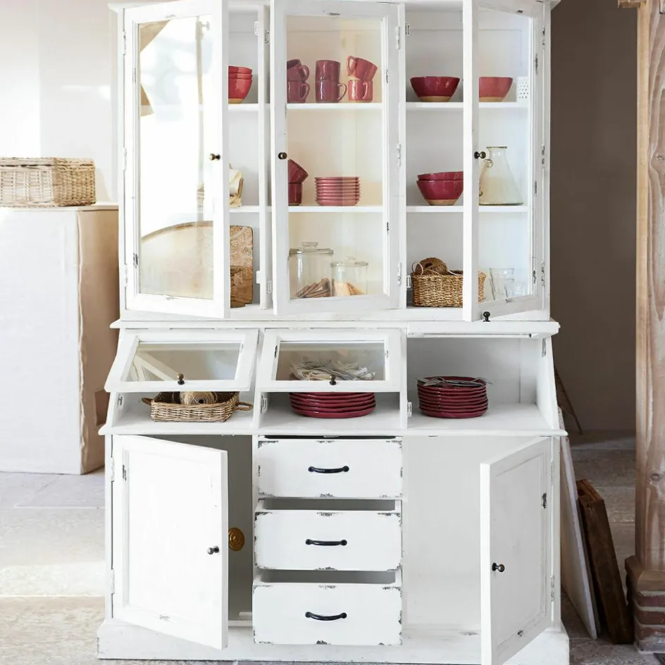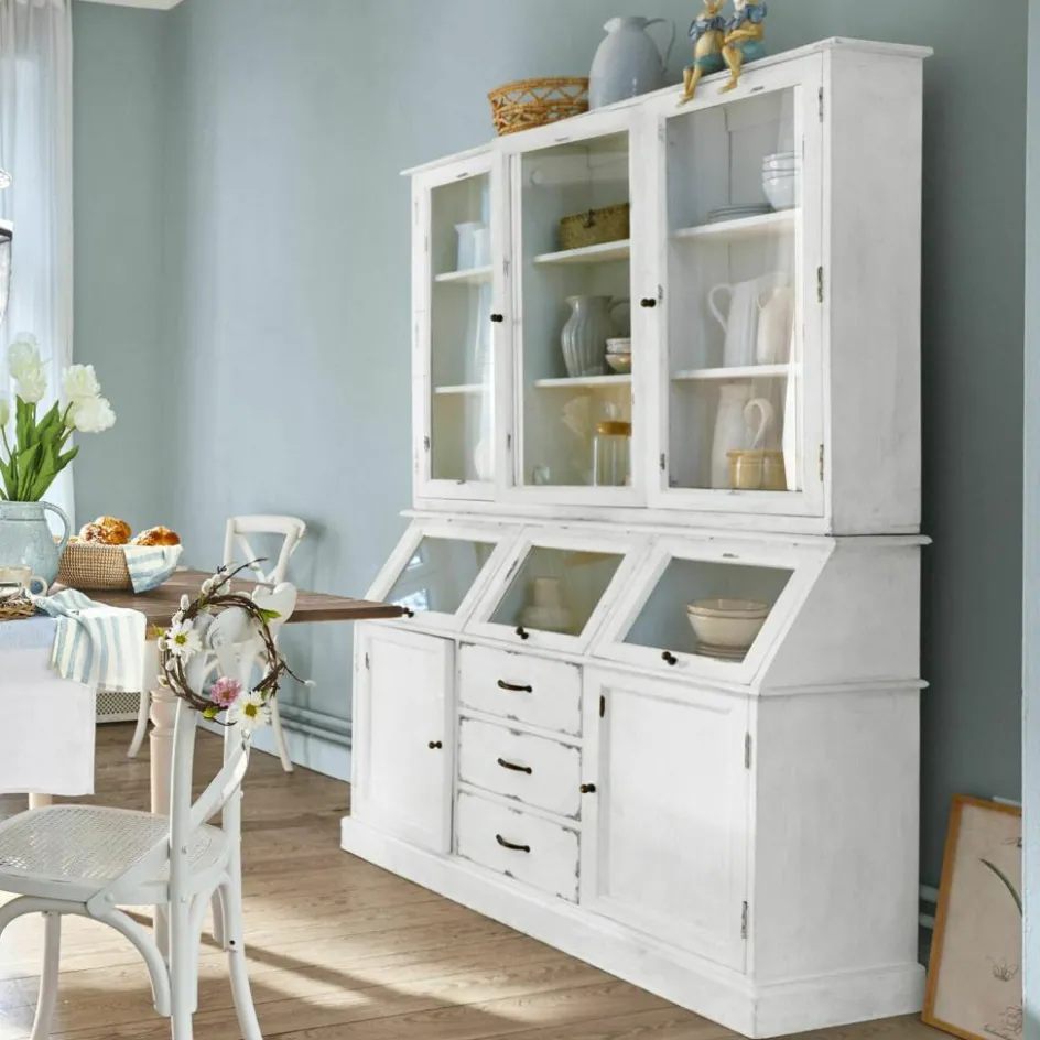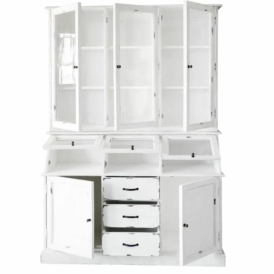Dieser zeitlos schöne Schrank ist ein Sinnbild für einen edlen Vintage-Look im großen Stil. Dabei ist er auch ein praktisches Stau- und Aufbewahrungswunder: Er bietet viel Platz für Geschirr und Besteck, Schüsseln, Töpfe und Gläser, aber auch Vasen und Dekoration – hier findet alles seinen rechten Ort. Der Ordnungshelfer, der durch sein Shabby-Finish aus historischen Zeiten zu stammen scheint, besticht zudem durch sein nachhaltiges Material, denn er ist komplett aus hochwertigem und langlebigem Mangoholz gefertigt. Ein zeitlos schönes Möbel, das Ihr Wohnambiente mit seinem historischen Flair stilvoll prägen wird.