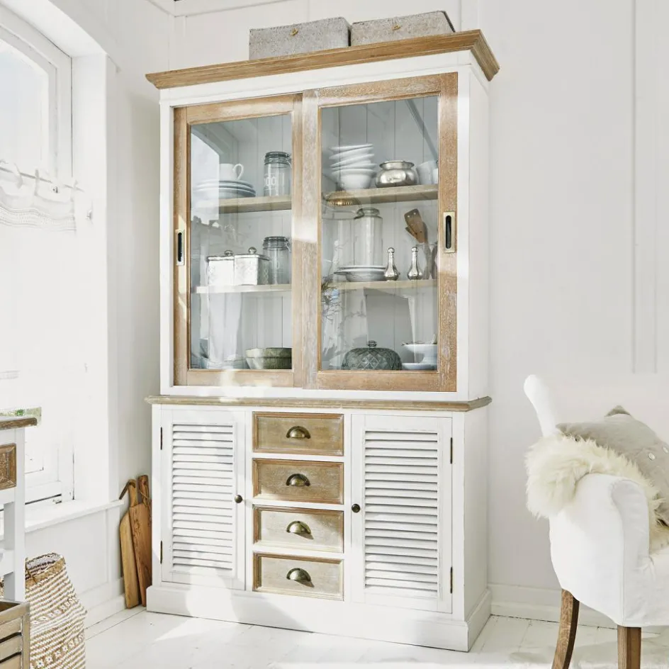 Ein echtes Prachtstück im klassischen Landhaus-Stil. Der hochwertige und attraktive, zweiteilige Schrank ist von Hand gefertigt und veredelt. Unter anderem wurden dafür Paulowniaholz und Glas verwendet. Ein feines Antik-Finish ziert das großzügige Modell. Sehr reizvoll wirken die farblich abgesetzten Elemente: Kranz, Einlegeböden, Türen und die vier Schubladen. Eine aus hübschen Latten versehene Rückwand und stilvolle Lamellentüren machen das Design perfekt. Für viel Stauraum und Ordnung sorgen zwei Schiebetüren, zwei Einlegeböden im oberen Bereich und zwei Türen mit jeweils einem fixierten Einlegeboden, sowie vier Schubladen im unteren Bereich. Hinter Glas kommen Ihre Schätze gut zur Geltung. Der perfekte Platz für Geschirr und alles andere, das Sie geschmackvoll und ordentlich verstauen möchten.