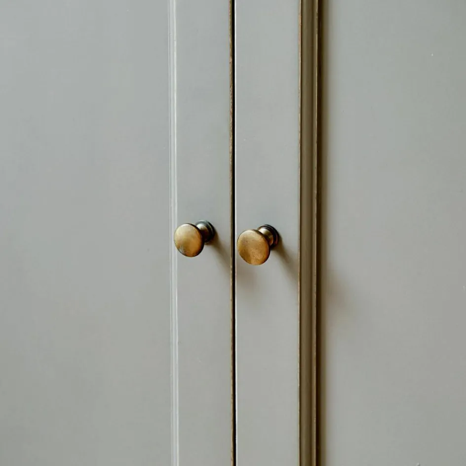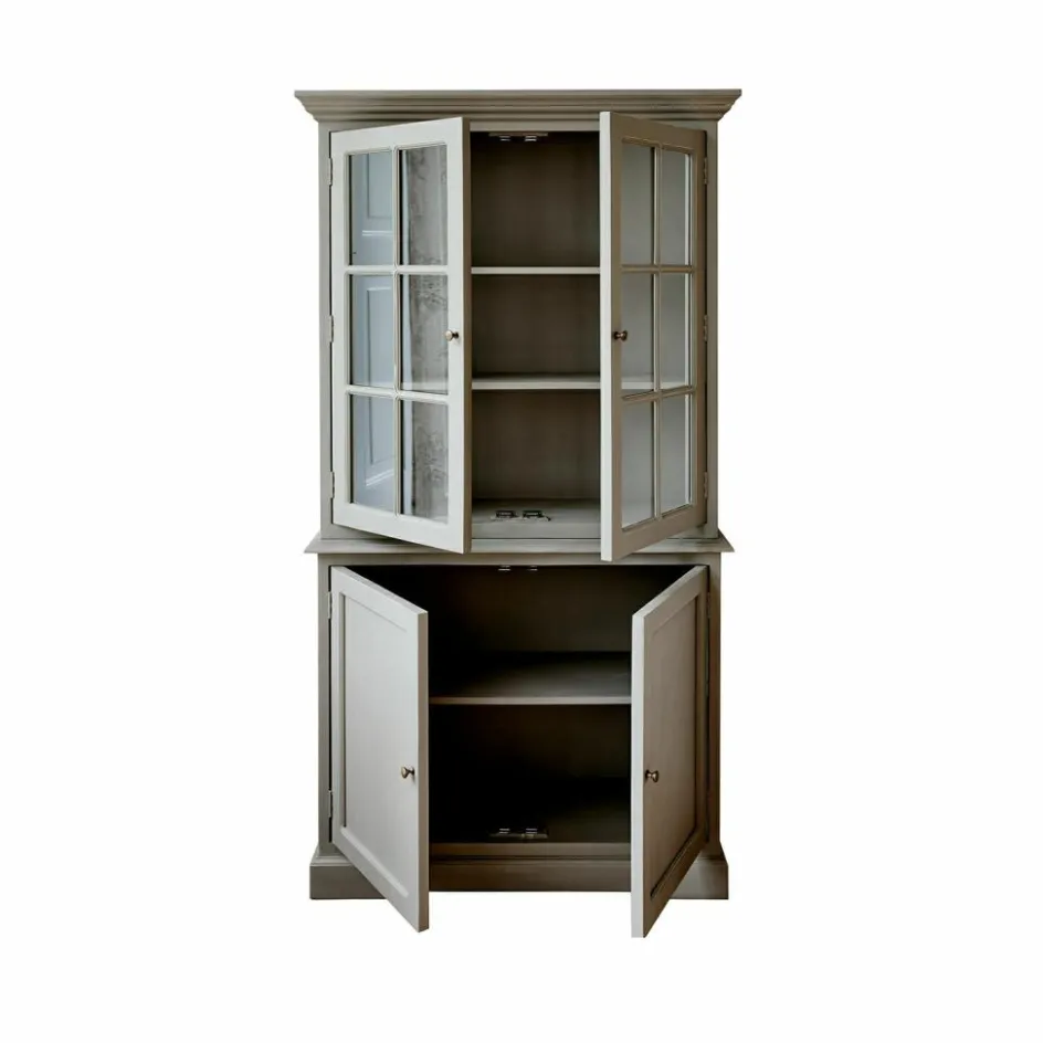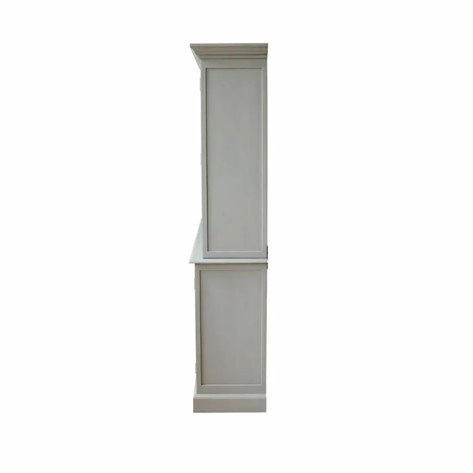 Der Buffetschrank ist ein Ausdruck zeitlosen Designs und höchster Funktionalität. Gefertigt aus massivem Holz, bietet dieser Schrank nicht nur eine beeindruckende Langlebigkeit, sondern auch eine elegante Präsenz in jedem Raum. Der dezente Grauton, veredelt mit einem dezenten Antik-Finish, verleiht ihm eine moderne Note, die sich problemlos in verschiedenste Einrichtungsstile integrieren lässt. Die großen Glastüren im oberen Teil setzen Ihre schönsten Stücke stilvoll in Szene, während der untere Teil mit seinen geschlossenen Türen genügend Platz für das Verstauen von Alltagsgegenständen bietet. Ein Möbelstück, das mit seiner gelungenen Kombination aus Form und Funktion überzeugt.