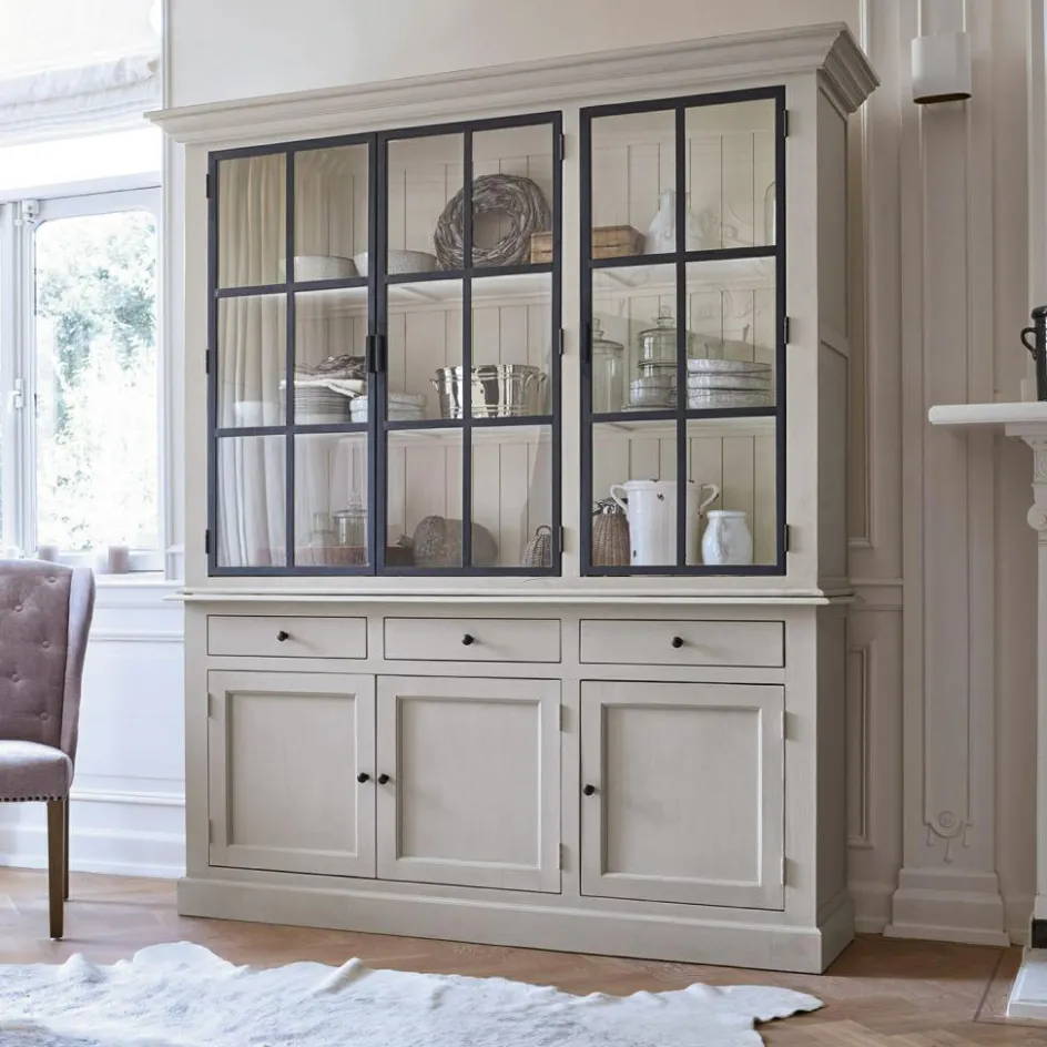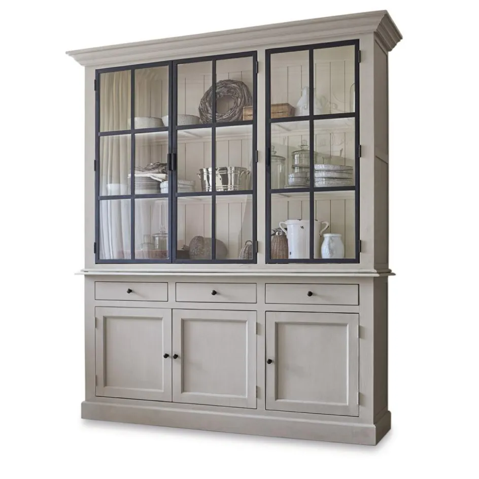 Edles Holz und Gusseisen sind bewährte Elemente des traditionellen Landhaus-Stils, selten aber sieht man sie so raffiniert kombiniert wie hier. Dieses Highlight traditioneller Möbelkunst wird Räume mit heimeliger Wohnlichkeit bereichern und dabei das nostalgische Flair längst vergangener Zeiten wachrufen, als die Uhren noch langsamer gingen und die Menschen mehr Zeit für Muße und Entspannung hatten. Um diese heiter gelassene Stimmung auch in Ihnen wachzurufen, reicht ein Blick auf die zahlreichen, liebevoll von Hand gefertigten Details wie den aufwändigen Kranz, den Versatz in der Mitte und die sauber gearbeiteten Kassettentüren. Die außergewöhnliche Raumpräsenz aber verdankt der Schrank den hohen Sprossentüren, die mit dunklen, gusseisernen Rahmen gefasst sind und in markantem Kontrast zu dem hellen Korpus stehen. Ein Schrank wie gemacht für elegante Wohn- und Speisezimmer, wo Sie Ihr gutes Geschirr, die edlen Gläser, die Tischwäsche, aber auch lieb gewonnene Accessoires unterbringen können. Dafür stehen Ihnen geschlossene Unterschränke, Schubladen sowie die Fächer hinter den Glastüren zur Verfügung. Die Rückwand hinter den Glastüren ist sorgfältig aus hellen Latten gefertigt, so dass dort platzierte Objekte besonders schön zur Geltung kommen. Ein solcher Schrank passt aber nicht nur in klassische Wohn- oder Speisezimmer, sondern auch in moderne Raumsituationen, in denen – wie heutzutage immer häufiger üblich – die Grenzen zwischen Kochen, Speisen und Wohnen verschwimmen und im Grund alles in einem großen Raum stattfindet.