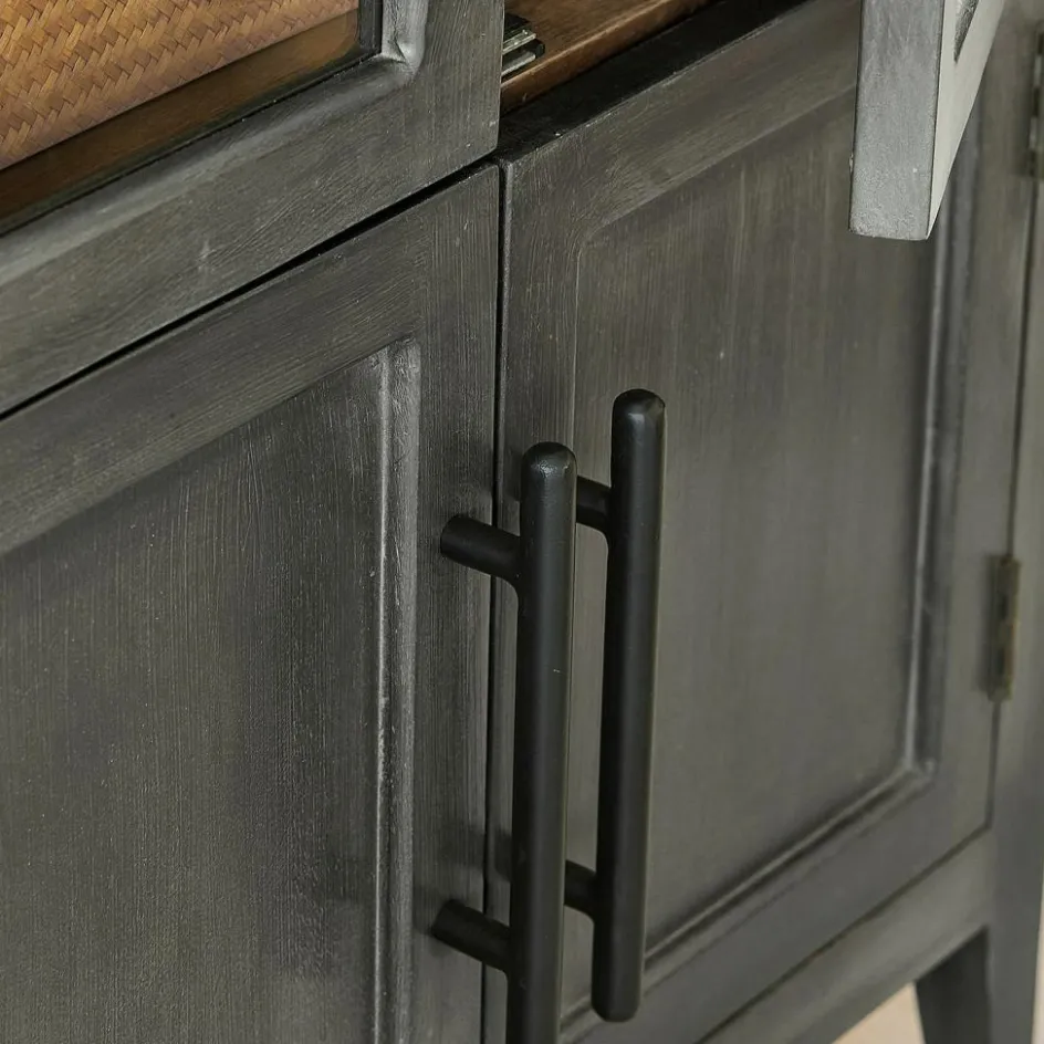 Verleihen Sie Ihrem Zuhause einen Hauch von rustikalem Charme mit diesem eleganten Schrank. Die sanfte Grau-Mattierung des Mangoholzgestells kontrastiert wunderschön mit der warmen, naturbelassenen Holzstruktur im Inneren. Perfekt konzipiert für Vielseitigkeit und Ästhetik, bietet dieser Schrank großzügigen Stauraum und eine strukturierte Organisation durch mehrere Regalböden. Die robusten Eisengriffe fügen dem minimalistischen Design eine industrielle Note hinzu, während die sanften Bögen des Oberbaus sowohl Stil als auch einzigartigen Charakter vermitteln.