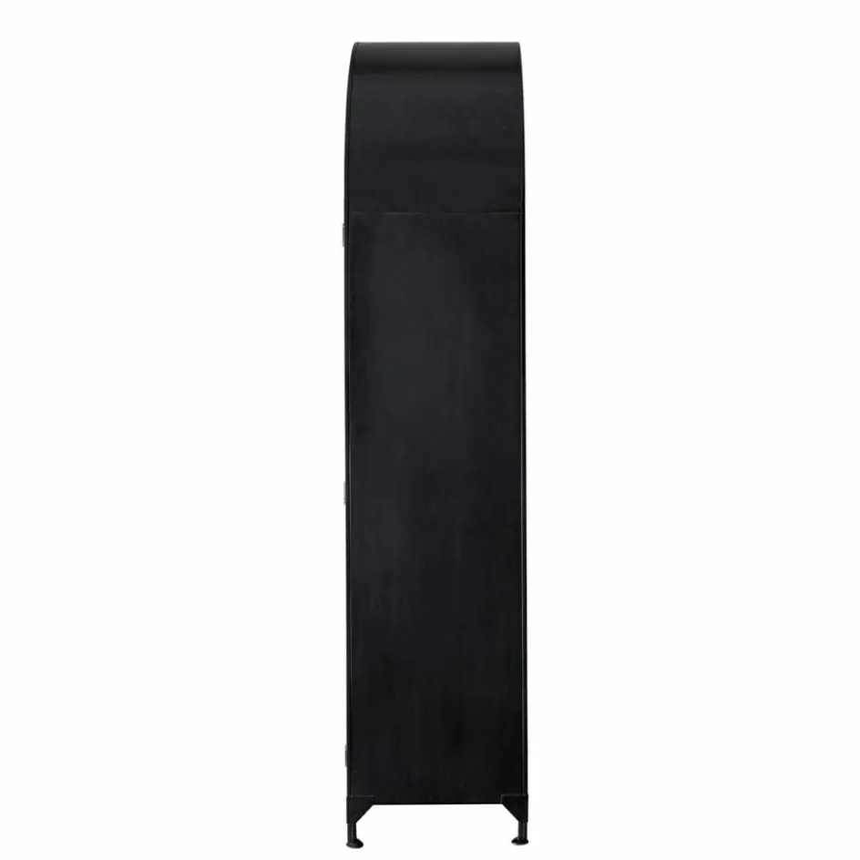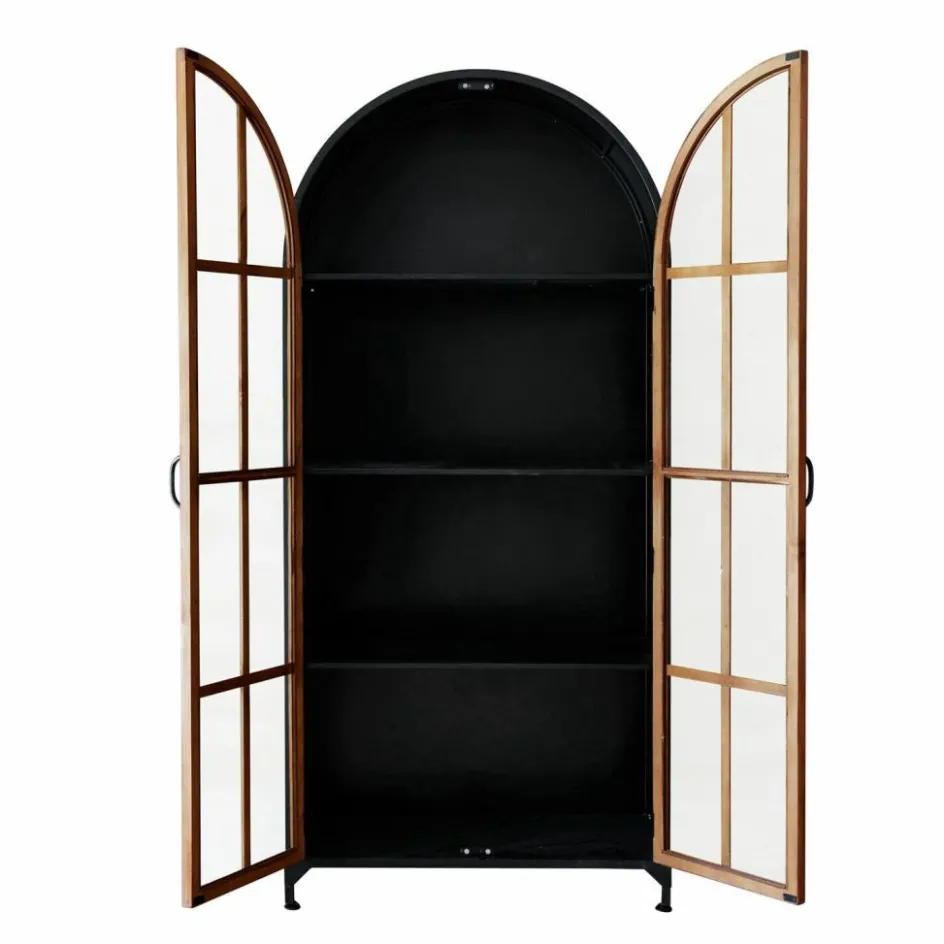 Was von weitem wie ein klassischer Vitrinenschrank aussieht, entpuppt sich bei näherem Hinschauen als ein Möbelstück, das eigentlich mit nichts zu vergleichen ist. Ein Detail erinnert an klassisches Landhaus, mit einem anderen versprüht er Vintage-Flair – kurz: eine spannende Mixtur verschiedener Stilrichtungen und Epochen, die dem Schrank Unverwechselbarkeit garantieren. Der Korpus besteht komplett aus schwarzem Eisen und sorgt für die souveräne Präsenz im Raum, während die beiden Glastüren mit den zierlichen Kiefernholzsprossen die Strenge mildern und ihm zugleich optische Leichtigkeit verleihen. Auch die gerundete Form und die geringe Tiefe tragen dazu bei, dass der Schrank trotz seiner stattlichen Höhe von knapp 190 cm den Raum nicht dominiert, sondern sich harmonisch ins Ensemble der anderen Möbel einfügt. Bücher, Porzellan oder geliebte Sammlerstücke werden auf den stabilen, schwarz lackierten Einlegeböden hervorragend zur Geltung kommen.