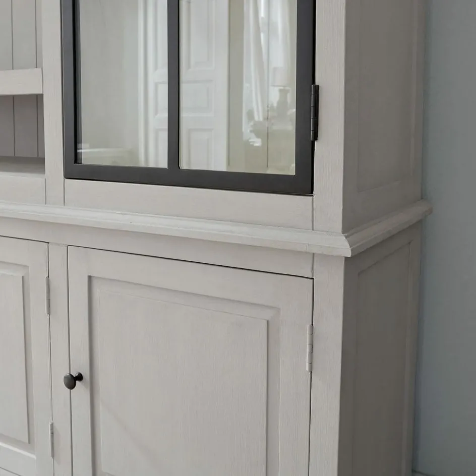 Das TV-Gerät und die Musikanlage, Bücher, CDs, Spiele, geliebte Erinnerungsstücke – im Laufe der Zeit sammelt sich in einem Haushalt eine Unmenge an Dingen an. Manche braucht man täglich, andere wieder selten und doch mag man sich nicht von Ihnen trennen. Wie schön, wenn man dann einen Aufbewahrungsort hat, der praktische Funktionalität mit Qualität und Design vollendet zu verbinden weiß! Dieser Schrank bietet Ihnen mit seinen stattlichen Maßen viel Platz für alles, was Sie im Wohnraum jeden Tag brauchen oder gerne jederzeit griffbereit hätten. Das fängt beim TV-Gerät und bei der Musikanlage an, die sich problemlos in den Schrank integrieren lassen, denn in der Rückwand sind bereits Aussparungen für die Kabel zum Anschluss der Geräte vorgesehen. Das hört bei den vielen anderen Dingen noch lange nicht auf, die Sie in den Fächern mit den Glastüren stilvoll präsentieren oder hinter den geschlossenen Schranktüten unsichtbar verstauen können. Und bei all diesen praktischen Vorzügen gelingt es dem Schrank zugleich, das optische Highlight im Wohnraum zu sein. Dazu tragen die klassischen Holztüren mit den Landhaus-typischen Verzierungen bei ebenso wie die hochwertige Lammellenrückwand und der aufwendig gearbeitete Kranzabschluss. Einen aparten Kontrast dazu bilden aber die Glastüren, deren Sprossen aus Eisen gefertigt sind und einen Hauch Industrial-Flair verbreiten. Ein Schrank, der den individuellen Charakter Ihres Zuhauses perfekt unterstreicht.