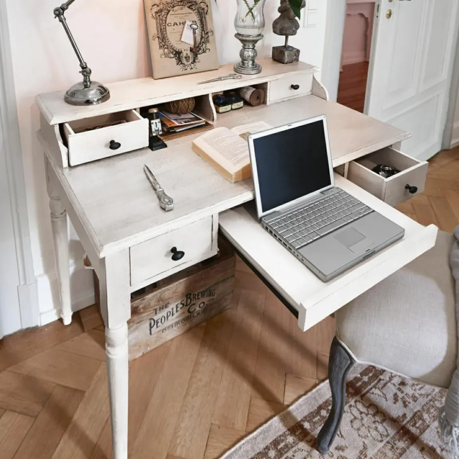 Dieser Sekretär wurde aus Naturholz gefertigt und in einem aufwendigen Verfahren mit Antik-Finish veredelt. Jeder Zentimeter seiner Oberfläche hat Charakter. Bei all der Schönheit, darf man den funktionellen Aspekt natürlich nicht vergessen. Neben der Schreiboberfläche stehen Ihnen vier Schubladen und zwei Ablagefächer zur Verfügung. Ganz oben befindet sich eine schmale Ablage und unter der Tischplatte ist ein Holzfaserbrett versteckt. Dieses lässt sich ganz bequem ein- und ausfahren – beispielsweise um eine Computertastatur darauf abzulegen.