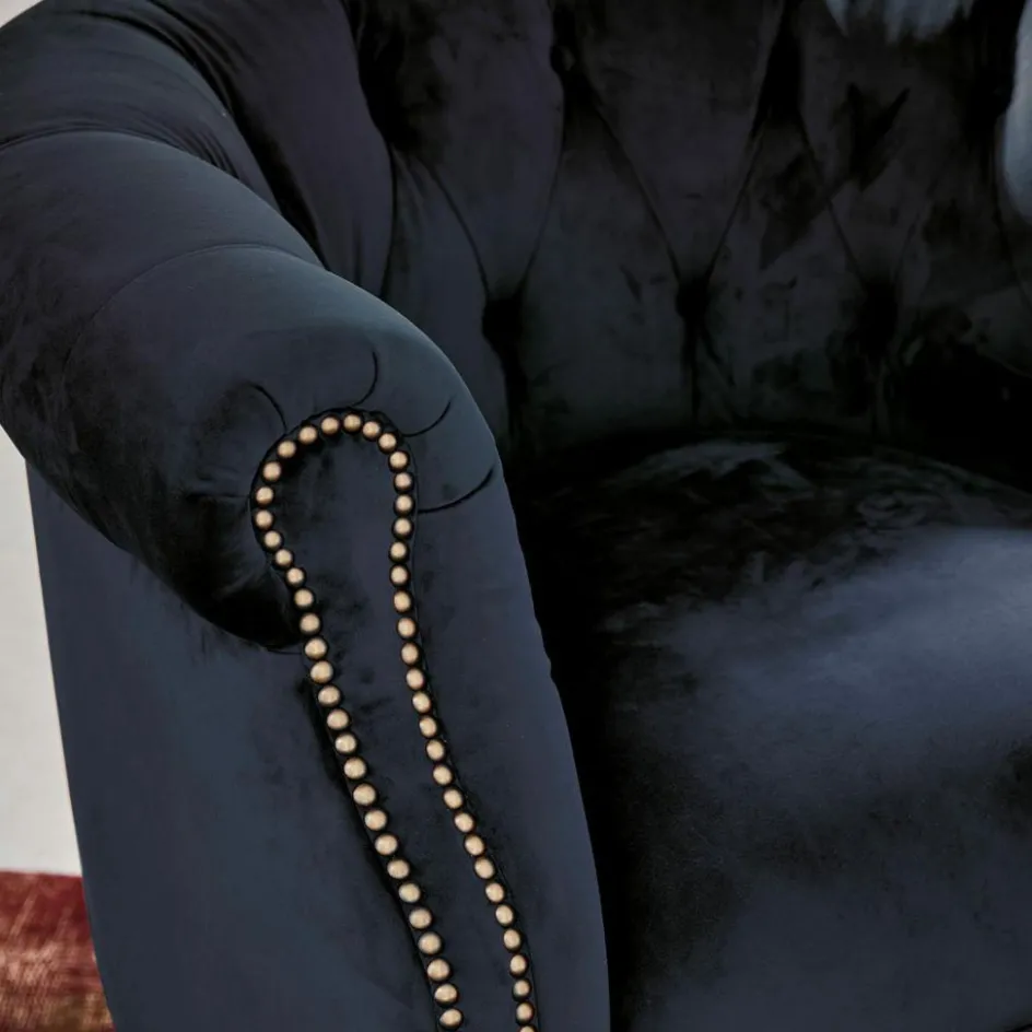 Elegant, bequem und gleichzeitig fest gepolstert – so sollte der Sessel werden, den um 1770 der Earl of Chesterfield bei dem berühmten Möbelbauer Robert Adams in Auftrag gab. Das war die Geburtsstunde dieses legendären Möbelstücks, das bis heute aus dem gehobenen Wohn-Ambiente nicht wegzudenken ist. Der Sessel, den wir Ihnen hier vorstellen, gibt sich im Gegensatz zu seinen historischen Vorbildern aber deutlich ladyliker. So verzichtet er auf den klassischen Bezug aus Rindsleder und lädt Sie vielmehr ein, sich in seinen samtweichen Bezug zu kuscheln. Eine Aufforderung, der Sie unbeschwert in jeder freien Minute nachkommen dürfen, denn der Samt wurde aus einer hochwertigen, strapazierfähigen Polyesterqualität gefertigt. Beibehalten wurde aber neben den voluminösen Rücken- und Armlehnen sowie der großzügigen Sitzfläche die typische Rautensteppung und die Nieten, die den Sessel zu einem besonderen Eye-Catcher im Raum machen. Und auch in puncto Polsterung folgt der Sessel dem Original. Denn immer mehr – nicht nur die Best-Ager – schätzen eine komfortable und dabei feste Polsterung. Abgerundet wird der stilvolle Look durch die traditionell von Hand aus hochwertigem Kautschukholz gedrechselten Füße. Ganz gleich, ob Sie am Abend am liebsten mit einem Ale, einem Whiskey oder einer Cup-of-Tea entspannen – Sie sollten dabei in diesem Sessel sitzen!