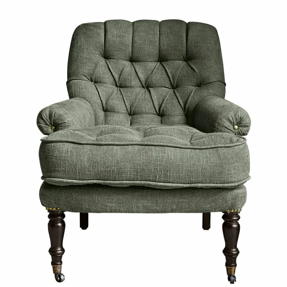 Very british, très chic, molto elegante – dieser Sessel ist ein kosmopolitischer Vagabund, der in vielen Ländern seine Anhänger hat. Und vielleicht bald bei Ihnen im Wohnzimmer zum stilvollen Platznehmen einlädt, denn die Kombination aus traditionellem Design und luxuriösem Sitzkomfort ist immer und überall gefragt. Neben der stilechten Chesterfield-Knopfheftung tragen auch die paspelierten Säume des komfortablen Sitzkissens zur noblen Note des Sessels bei, während die beiden Armlehnen und die hohe Rückenlehne Sie wie in einer sanften Umarmung halten. Zu dem unvergleichlichen Wohlgefühl, das Sie in diesem Sessel spüren werden, trägt auch der Bezugsstoff bei, der eine interessant unregelmäßige Oberflächenstruktur zeigt, durch den Mix aus Viskose und Baumwolle aber mit einer weichen Haptik verwöhnt. Abgerundet wird der exklusive Sessel durch die beiden handgedrechselten Füße aus edlem Mangoholz, die außerdem mit kleinen Rollen ausgestattet sind, so dass der Sessel auf Wunsch auch mobil ist.