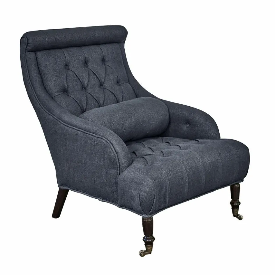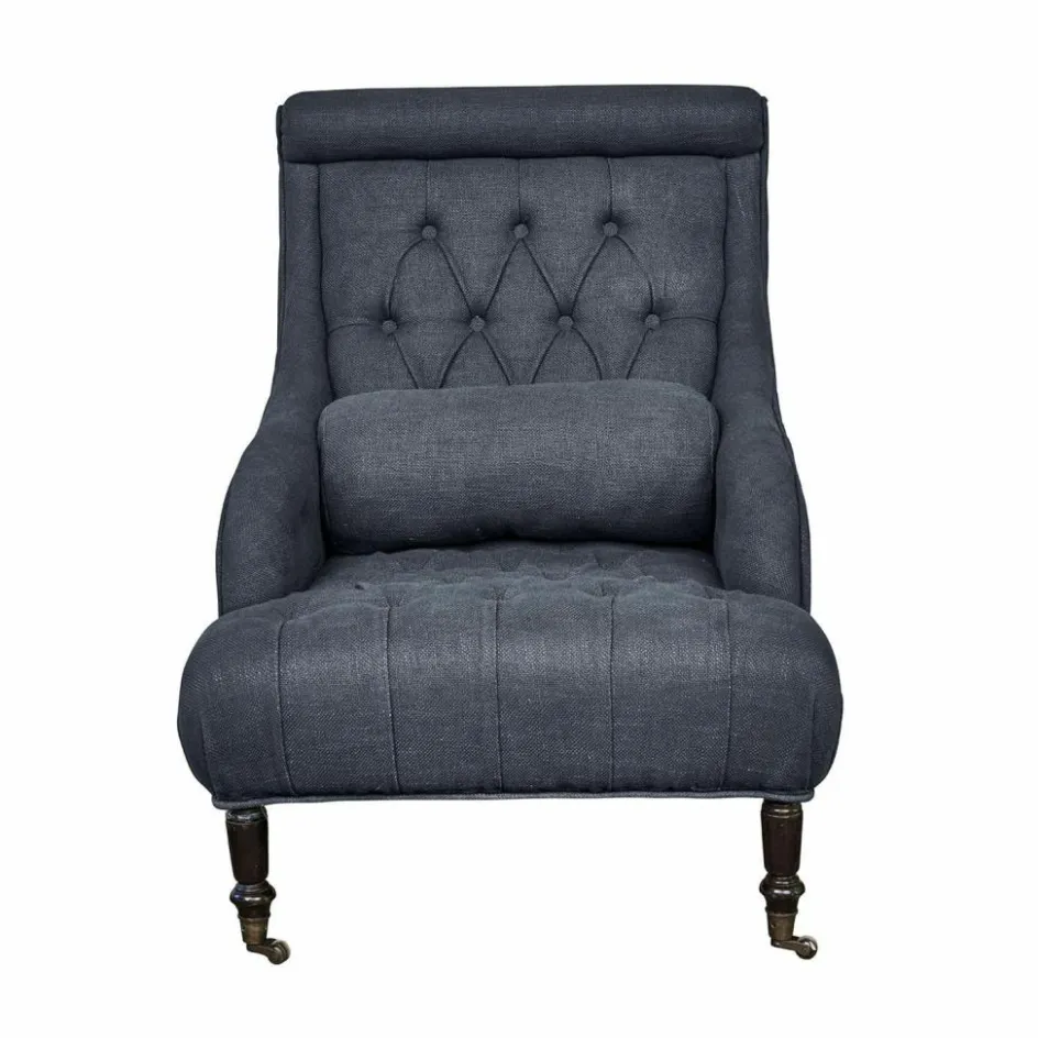 Die besondere Ausstrahlung dieses Sessels liegt in seiner Kombination aus prägnanter Formensprache und textiler Raffinesse. Der strukturierte Stoffbezug in tiefem Blau bringt eine feine Körnung mit, welche die Chesterfield-Knöpfung besonders wirkungsvoll in Szene setzt. Die Rückenlehne verläuft geschwungen und endet in einem gerollten Abschluss, der an historische Möbelklassiker erinnert. Arm- und Sitzflächen sind weich gepolstert, die Rückenrolle unterstützt komfortables Zurücklehnen. Zwei gedrechselte Vorderbeine mit Rollen verleihen dem Sessel eine subtile Mobilität – und eine charmante Note von Salonstil. Ein Solitär, der Behaglichkeit und Eleganz mit souveräner Haltung verbindet.