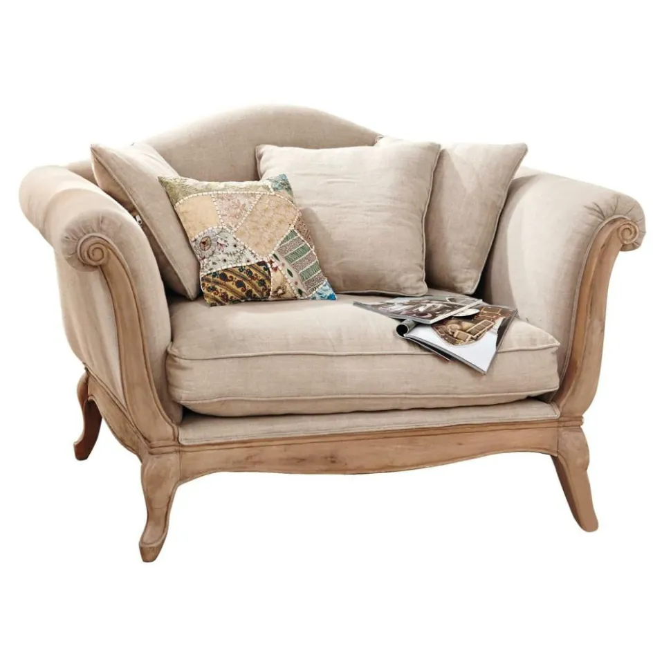 Wertvolle Schnitzereien im antikbraunen Mangoholz-Gestell und der Bezug aus reinem Leinen machen es leicht, sich sofort in diesen Sessel zu verlieben. Die komfortable Schaumstoff-Polsterung, das stabil gearbeitete Gestell und drei zusätzliche Kuschelkissen machen aus der „Liebe auf den ersten Blick“ dann eine Verbindung fürs Leben. Die duldet übrigens jederzeit einen menschlichen Nebenbuhler – das XXL-Format des Sessels bietet Platz für zwei.