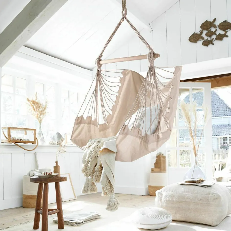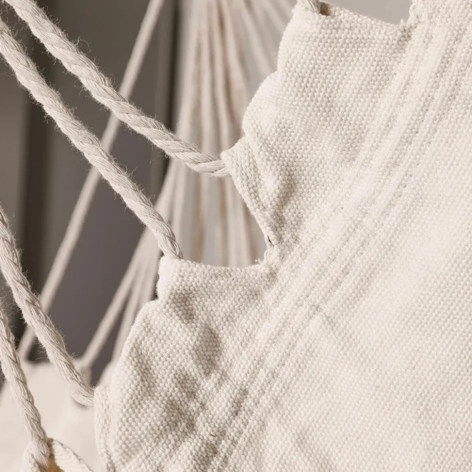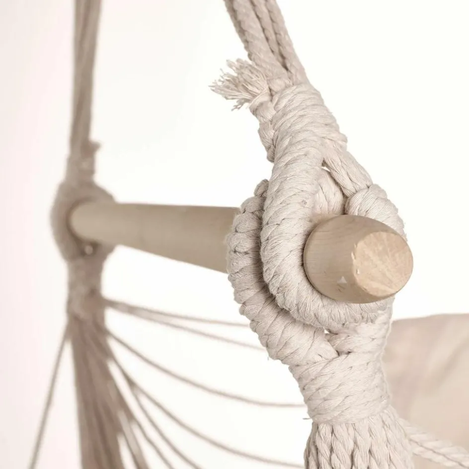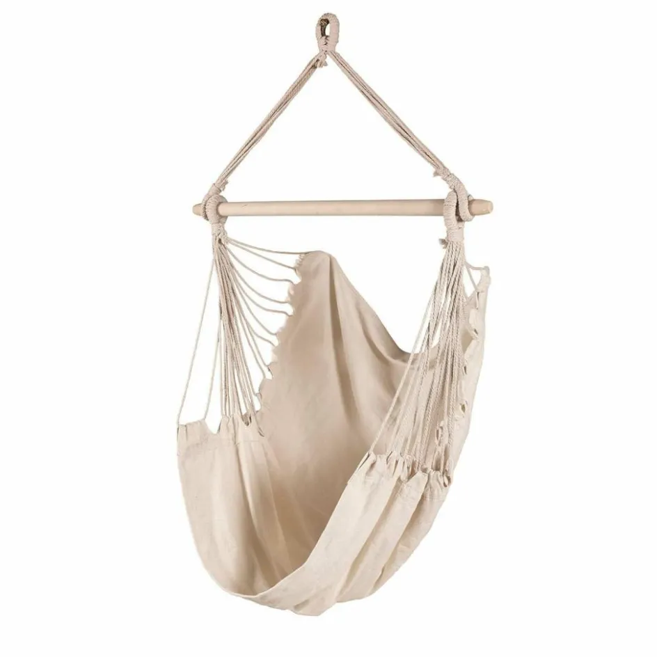 Sie schaukeln gerne und lieben das Gefühl zu schweben? Dann gehört der Hängesessel definitiv auf Ihren Wunschzettel. Ob an einem starken Ast im Garten oder an einem Haken an der Decke Ihres Wohnzimmers: In dem cremefarbenen Schaukel-Sessel lässt es sich herrlich entspannen und vom Alltag abschalten. Das robuste Baumwollgewebe von Hängesessel und dem gemütlichen Sitzkissen ist an einer stabilen Birkenholzstrebe und festen Stricken befestigt. Das gibt zusätzliche Sicherheit wenn die Füße vom Boden abheben. Ab diesem Moment avanciert der Hängesessel zum absoluten Lieblingsplatz Ihres Zuhauses und dient als Rückzugsort für gemütliche Schmöker-Nachmittage, traumhafte Momente in absoluter Ruhe oder als Mittelpunkt furioser Circus-Vorstellungen. Denn aufgepasst: Kinder werden an diesem Ding unweigerlich zu quirligen Akrobaten. Nach dem Zubettbringen der Kleinen haben Sie das Schmuckstück dann aber wieder ganz allein für sich.