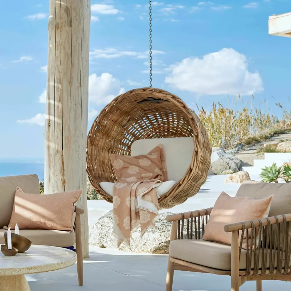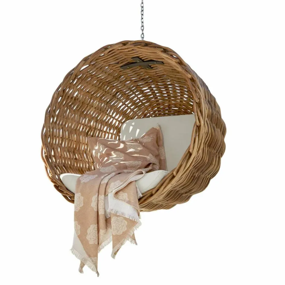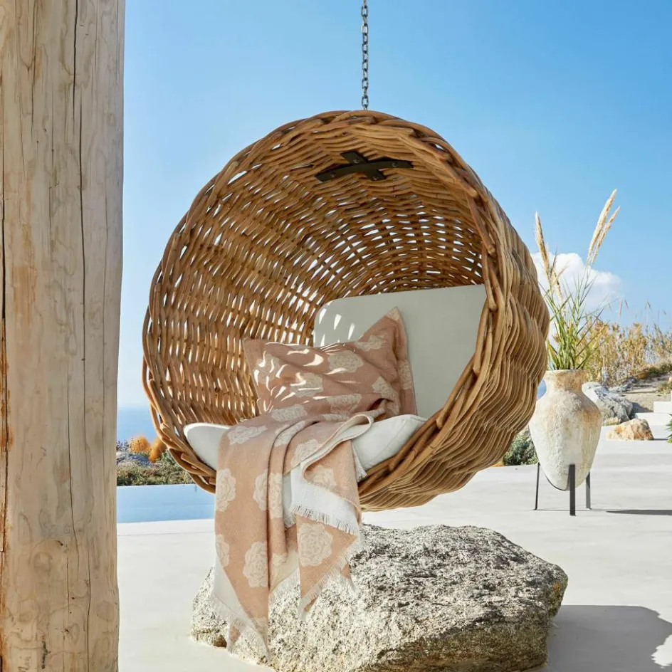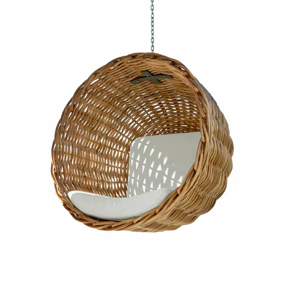 Sich zurücklehnen und die Ruhe genießen – dieser Hängesessel aus natürlichem Rattan lädt dazu ein, den Alltag hinter sich zu lassen. Das stabile Gestell wird durch eine Eisenkette ergänzt, die eine sichere Befestigung ermöglicht und gleichzeitig den luftigen Charakter dieses Möbelstücks unterstreicht. Das aneinander genähte Kissen vereint Sitz- und Rückenkomfort in einem, während der Bezug aus schnelltrocknendem und waschbarem Olefinstoff für hohe Strapazierfähigkeit sorgt. So bleibt der Sessel auch nach einem plötzlichen Regenschauer schnell wieder einsatzbereit. Perfekt für den Garten, die Terrasse oder den Balkon, wo Sie Entspannung und Stil in einem finden.