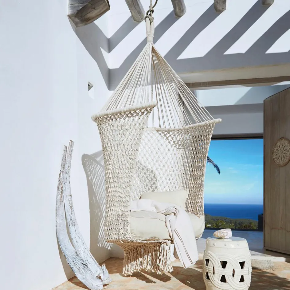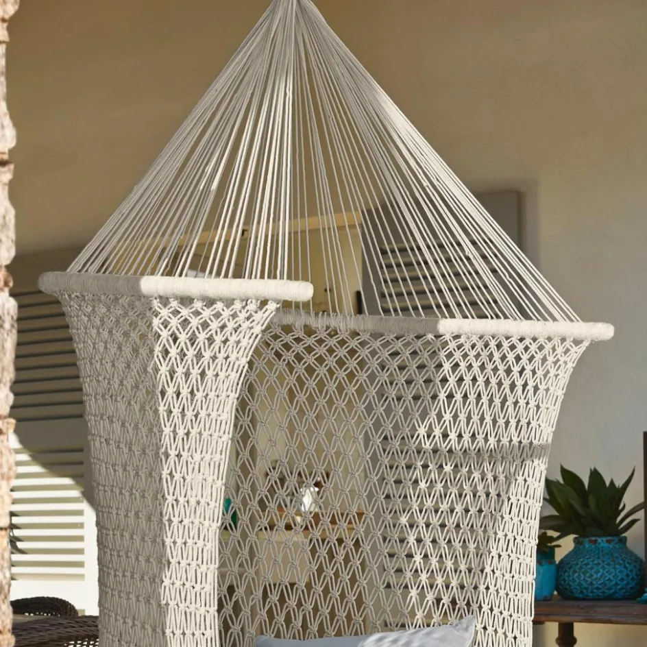 Einfach einmal Auspannen − das ist mit diesem Hängesessel ein bequemer Genuss. Hier kommen auch Puristen voll auf ihre Kosten. Der Hängesessel verfügt über eine Öse, an der Sie ihn einfach aufhängen können. Ob an einem rustikalen Fachwerkbalken, unter Ihrem Lieblingsbaum, auf der Terrasse oder einfach in Ihrem Wellnesszimmer, dieses Design ist geschaffen für pure Genießer. Das runde Sitzkissen und das rückenstabilisierende Rückenkissen sind im Lieferumfang enthalten. Die Kissen sorgen für einen sehr angenehmen Sitzkomfort, während Sie in Ihrem Hängesessel leicht hin und her schwingen. So erleben Sie fast schwerelose Entspannung, die den Stress des Alltags schnell vergessen lässt. Das feine Makramee ist traditionelle Handarbeit, die in diesem Hängesessel mit viel Geschick und Erfahrung zu Ihrer vollen Blüte gelangt. Stilvoll und aus reiner Baumwolle gefertigt lässt sie den Wind sanft hindurchgleiten. Das ist im Garten ein besonders angenehmes Gefühl. Außerdem bezaubert der Hängesessel seine Umgebung mit seinem hellen und leichten Design, das an Urlaub, Palmen und Strände erinnert. Die eingebunde Eisenstange verstärkt diesen Eindruck und sorgt nebenbei für eine gute formstabile Qualitätsarbeit, die bis zu 80 kg tragen kann. Erstaunlich, denn dagegen ist der Hängesessel selbst ein Federgewicht.