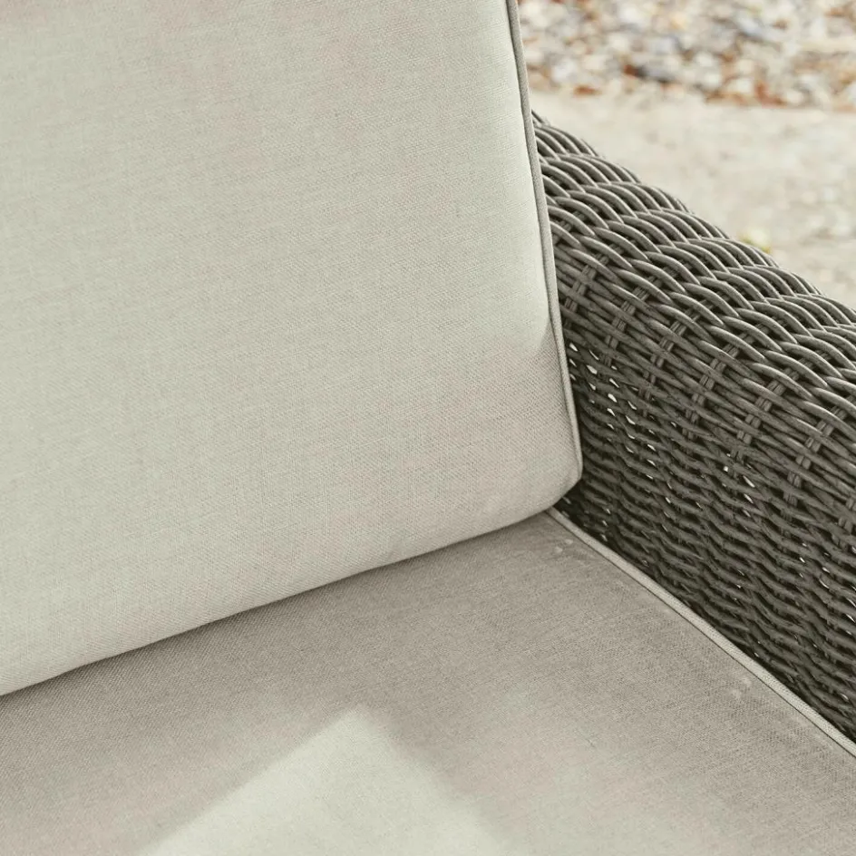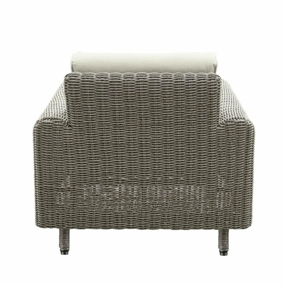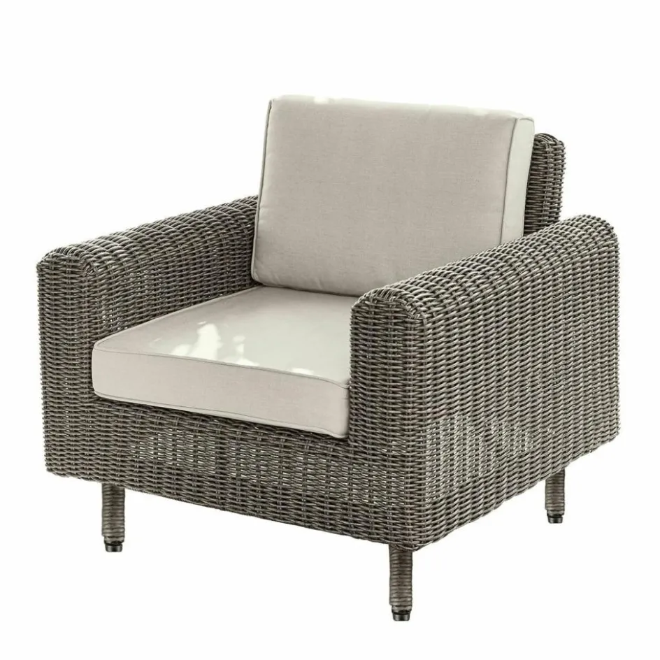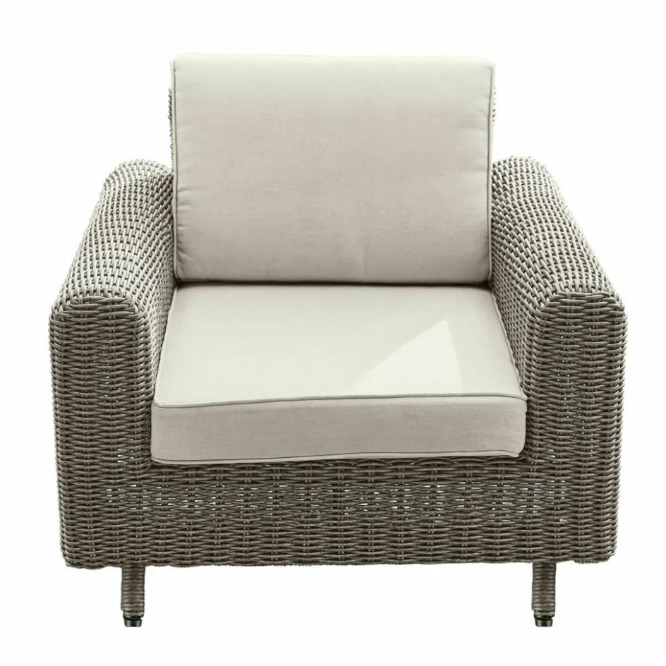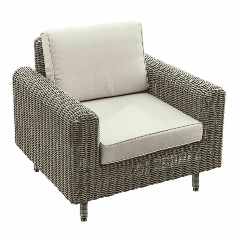 Genießen Sie es auch so sehr, dass die Sommer nördlich der Alpen mediterrane Qualitäten entwickeln und noch öfter dazu einladen, möglichst viele schöne Momente unter freiem Himmel zu genießen? Dann sollte in Ihrem Outdoor-Bereich aber auch ein Sessel wie dieser hier nicht fehlen. Denn diesem Sessel gelingt die perfekte Verbindung von exklusivem Design und bester Wettertauglichkeit. Mit seinen großzügigen Maßen und der niedrigen Sitzhöhe verbreitet der Sessel entspanntes Lounge-Feeling, während das robuste Polyrattan-Geflecht mit ausgezeichneter Wetterfestigkeit punktet. Es wurde in traditioneller Handwerkstechnik um ein stabiles Alu-Gestell geflochten, so dass der Sessel mit einem stattlichen Gewicht von 120 kg belastet werden kann. Die komfortabel dicken Kissen haben einen Bezug aus einem strapazierfähigen Polyestergewebe und können sogar abgezogen und gewaschen werden. Tipp: Im gleichen Look gibt’s ein großes Sofa (21926) oder eine komplette Sitzgruppe mit Sofa und 2 Sesseln (22039).