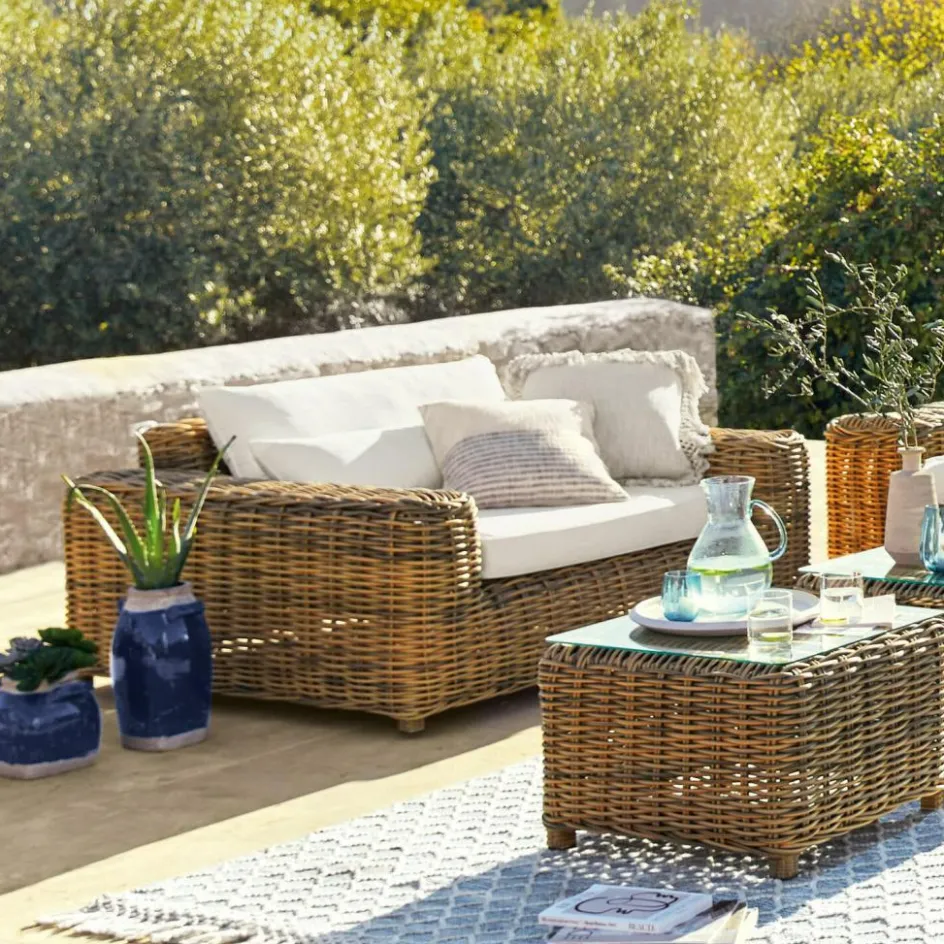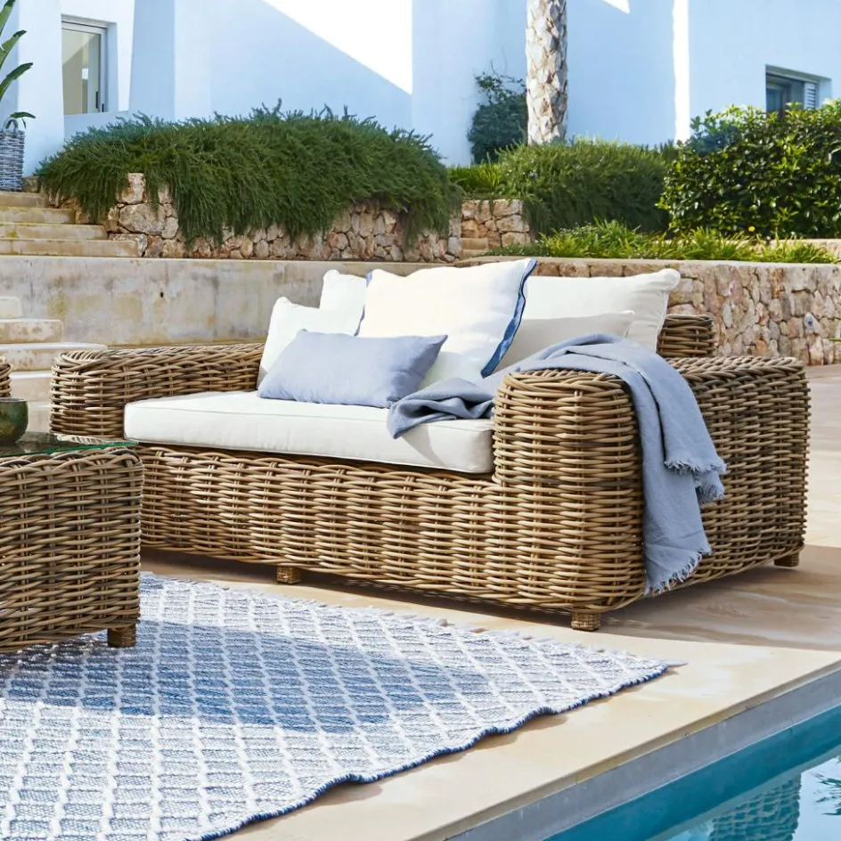 Das attraktive und hochwertige Modell wirkt sehr edel und ist natürlich wetterfest. Das Gestell besteht aus Stahl, das dekorative Geflecht ist aus Polyrattan. Die Füße sind aus wertvollem Akazienholz und die bequemen Polster sind mit wetterfestem Polyester bezogen. Inklusive sind bereits das komfortable Sitzkissen, ein Rückenkissen und ein längliches Deko-Kissen. Sie müssen sich nur noch niederlassen und den Sommer genießen. Und damit Willkommen an Ihrem neuen Lieblingsplatz in der Sonne. Dieser elegante Outdoor-Sessel bringt luxuriöses Lounge-Flair in Ihren Garten oder auf die Terrasse. Machen Sie es sich hier mit einem kühlen Getränk bequem und genießen Sie die Sonnenstrahlen – wie ein entspannter Urlaub zu Hause.