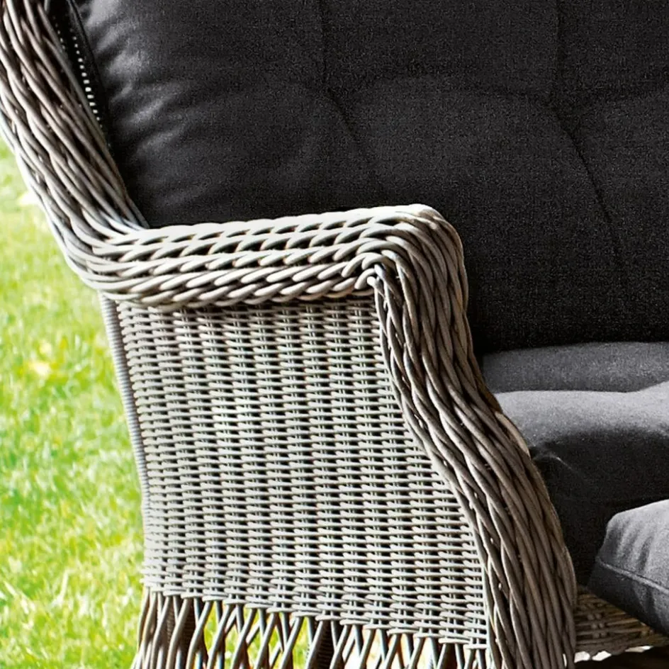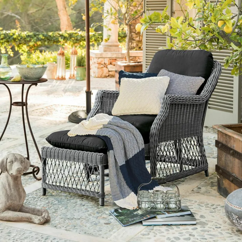 Riechen Sie den Lavendel? Schmecken Sie den süßen, roten Wein, das würzige Olivenöl? Dann hat Sie der Zauber des Outdoor-Sessels „Howe“ bereits gepackt. Finden Sie nicht auch? Wie aus dem verwunschenen Garten Ihres Ferienhauses in der Provence entsprungen, entführt Sie allein der Anblick des kunstvoll gearbeiteten Polyrattan-Geflechts immer wieder an die schönsten Orte dieser Welt. Der Clou: Mit einem Handgriff lässt sich ein Fußteil unter dem Stuhl heraus ziehen. Entspannen gehört bei diesem Sessel aus Kunststoffgeflecht also absolut zum guten Ton und daher natürlich auch zum Lieferumfang. Der stabile Alu-Rahmen, um den der graue Kunststoff geflochten wurde, verspricht Langlebigkeit. Ebenso das Polyrattan selbst, das mit enormer Witterungsbeständigkeit besticht und sich bei Bedarf ganz einfach mit dem Gartenschlauch reinigen lässt. Der Sitzkomfort wird darüber hinaus gekrönt von zwei dick gepolsterten Schaumstoffauflagen und einem gesteppten Rückenkissen mit strapazierfähigen, schwarzen Kissenbezügen. Sie waren noch nie in der Provence? Mit dem „Howe“ glauben Sie schon bald daran.