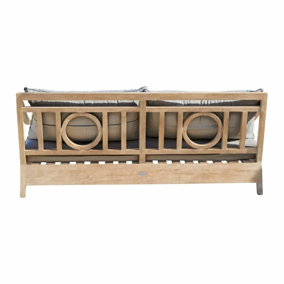 Wenn sich am Morgen ein himmelblauer Sommerhimmel über Ihrem Garten wölbt, wissen Sie, dass Sie jetzt wieder einen jener kostbaren Tage erleben werden, an denen sich entspanntes Urlaubs-Feeling einstellt, sobald Sie die Terrasse betreten. Vielleicht nehmen Sie schon Ihren Cappuccino in der Sitzgruppe ein, vielleicht gönnen Sie sich am Nachmittag ein gemütliches Stündchen auf dem Sofa, auf jeden Fall aber lassen Sie den Tag dort ausklingen, solo, zu zweit oder mit Gästen. An der heiter gelösten Stimmung jener Stunden hat die Sitzgruppe einen nicht unerheblichen Anteil, denn sie verbreitet das stilvolle Flair eines gastlichen Hauses und verwöhnt alle mit luxuriösem Sitzkomfort. Und wie die weichen Sitz- und Rückenpolster zum Platznehmen und Verweilen einladen, zeugen die aufwendig gearbeitete Rückseite, die elegant geschwungenen Armlehnen und die liebevoll gedrechselten Füße von der Passion des Künstlers für sein Handwerk. Und mit dieser Sitzgruppe hat er ein Meisterstück geliefert. Das wiederaufbereitete Teakholz sorgt nicht nur für die gute Wetterbeständigkeit der Sitzgruppe, sondern kann durch das dezente White-Washed-Finish auch eine besonders ausdrucksstrake Maserung zeigen. Die Kissen haben einen Outdoor-geeigneten Bezug mit Abperleffekt, was ihn also wasserabweisend macht. Die Bezüge lassen sich bei Bedarf auch gerne abnehmen. Noch ein praktisches Detail: Die Sitzkissen werden mit Klettbändern an den Latten fixiert.