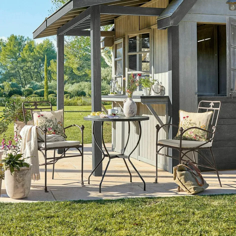 Holen Sie sich mediterranes Flair in Ihr gemütliches Sommer-Refugium. Dieser Stuhl im französischen Landhaus-Look schafft auf der Terrasse, im Garten oder Patio ein zauberhaftes Ambiente. Handgefertigt aus stabilem Eisen zeigt er sich in verspielt elegantem Design – wunderschön mit stilvollen Ornamenten, hoher Rückenlehne zum bequemen Anlehnen und luftzirkulierender Sitzfläche mit netzartiger Struktur. Die Pulverbeschichtung mit Rost-Finish verleiht reizvollen Nostalgie-Charme und macht das Sitzmöbel witterungsbeständig, so dass es auch einen spontanen Regenschauer nicht übel nimmt. Im Lieferumfang inbegriffen ist das weich gepolsterte Sitzkissen, dessen Bezug aus reinem Leinengewebe abnehmbar und waschbar ist. Der Metallstuhl lässt sich durch den passenden Tisch Nr. 21679 zu einer gemütlichen Sitzgruppe komplettieren.
