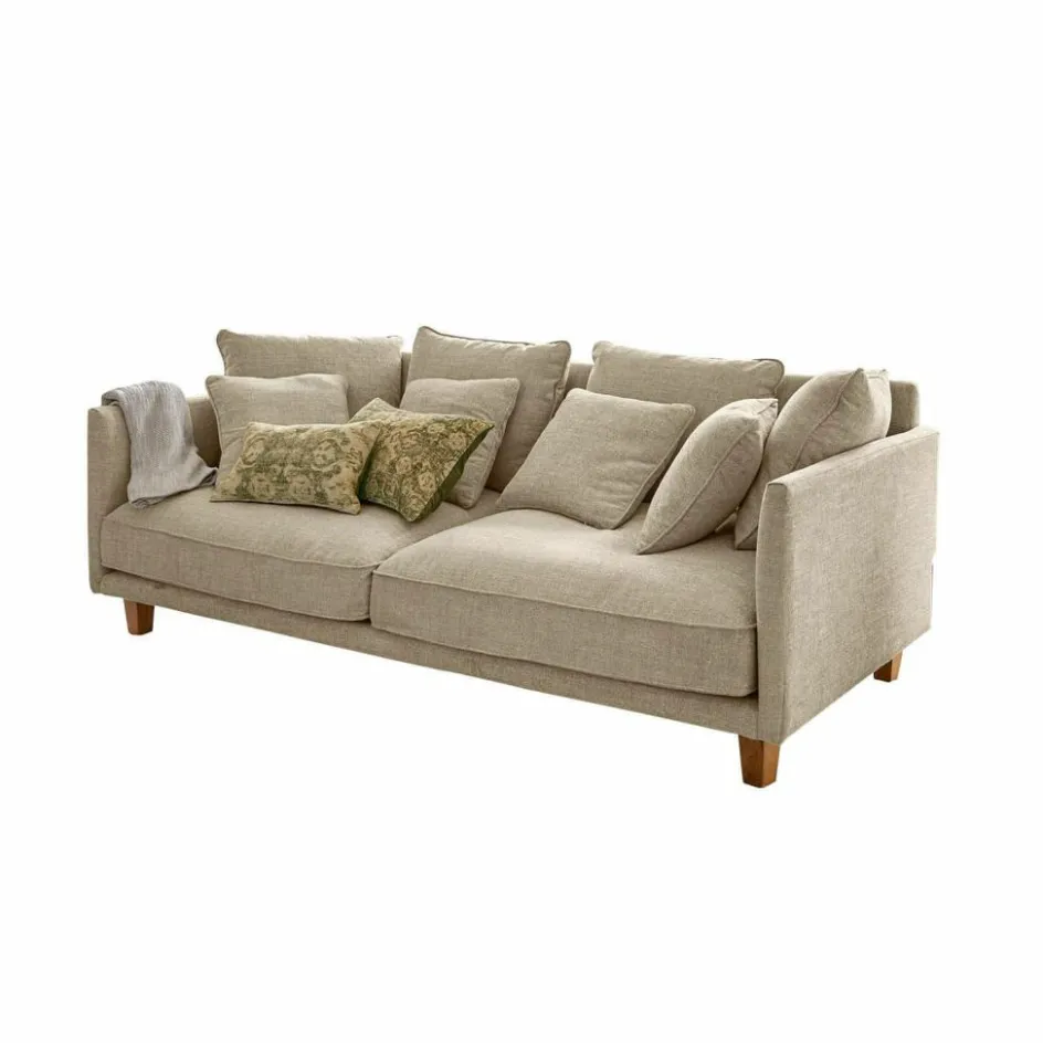 Erleben Sie ultimativen Komfort und stilvolle Eleganz mit diesem exquisiten Sofa. Das moderne Design wird durch den dicken, strapazierfähigen Stoff unterstrichen, der in einem zeitlosen, hellen Beigeton gehalten ist. Trotz seiner Robustheit fühlt sich der Stoff überraschend weich an und lädt zum ausgiebigen Verweilen ein. Die großzügigen Polster und Kissen bieten eine optimale Unterstützung und sorgen für ein luxuriöses Sitzerlebnis. Ob für entspannte Abende mit der Familie oder gemütliche Stunden mit einem guten Buch, dieses Sofa wird schnell zum Lieblingsplatz in Ihrem Zuhause.
