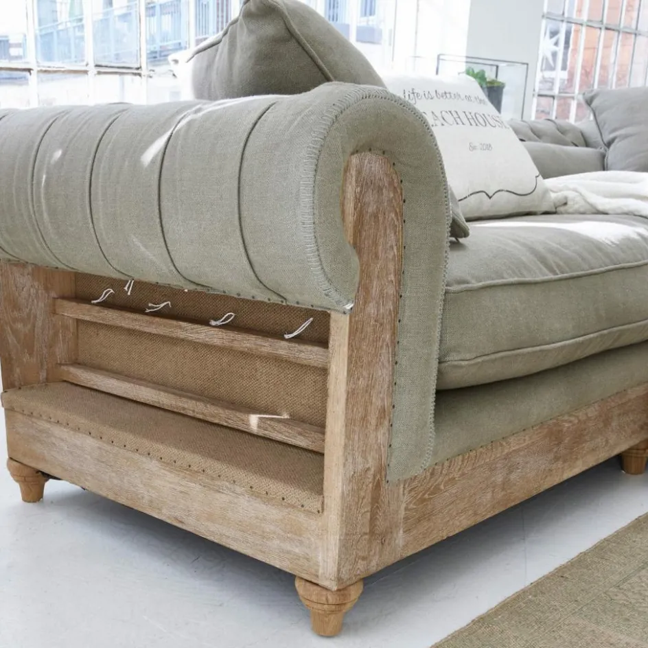 Luxus im Shabby-Chic mit Charme und Patina. Das wertvolle, große Sofa überrascht mit reizvollen Details, denn durch die offenliegenden Seiten schauen Sie auf das schöne Gestell aus Eichenholz. Der Bezug besteht aus edlem Leinen und ist leicht strukturiert. Ziernähten und Nieten geben dem Ganzen noch mehr Persönlichkeit. Die schon enthaltenen Zierkissen sorgen für noch einen höheren Kuschel-Faktor und extraviel Gemütlichkeit. Das hochwertige Prachtstück bezaubert alle, die das Individuelle zu schätzen wissen. Eine außergewöhnlich Optik, die fasziniert. Es passt perfekt zum Landhaus-Stil und Shabby-Chic. Hierauf sitzen Sie besonders komfortabel, und der Alltag fällt von Ihnen ab. Genießen Sie einen guten Film, ein Buch oder gute Gespräche. Das großzügige Design hat auch für mehrere Personen ausreichend Sitzfläche. Verleben Sie mit diesem Schmuckstück eine wunderbare Auszeit, vielleicht auch mit Freunden und der Familie. Eine großartige Wahl für alle Individualisten.