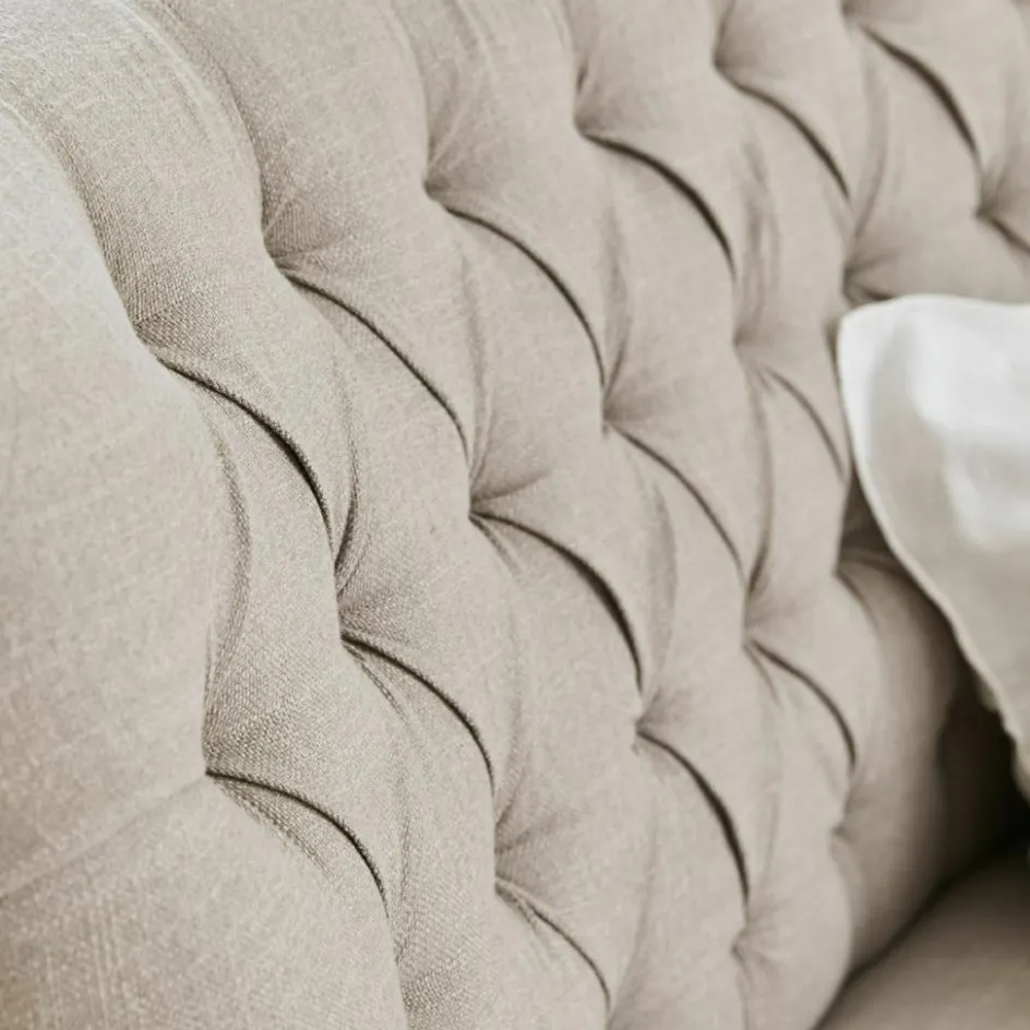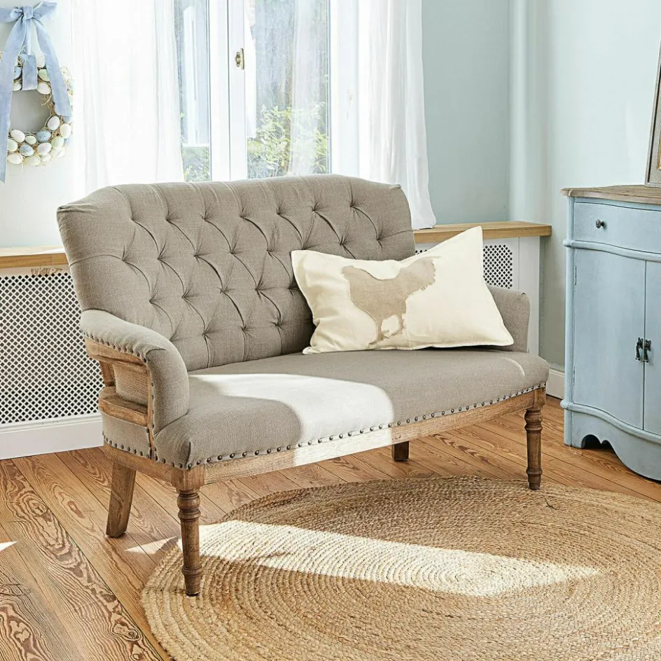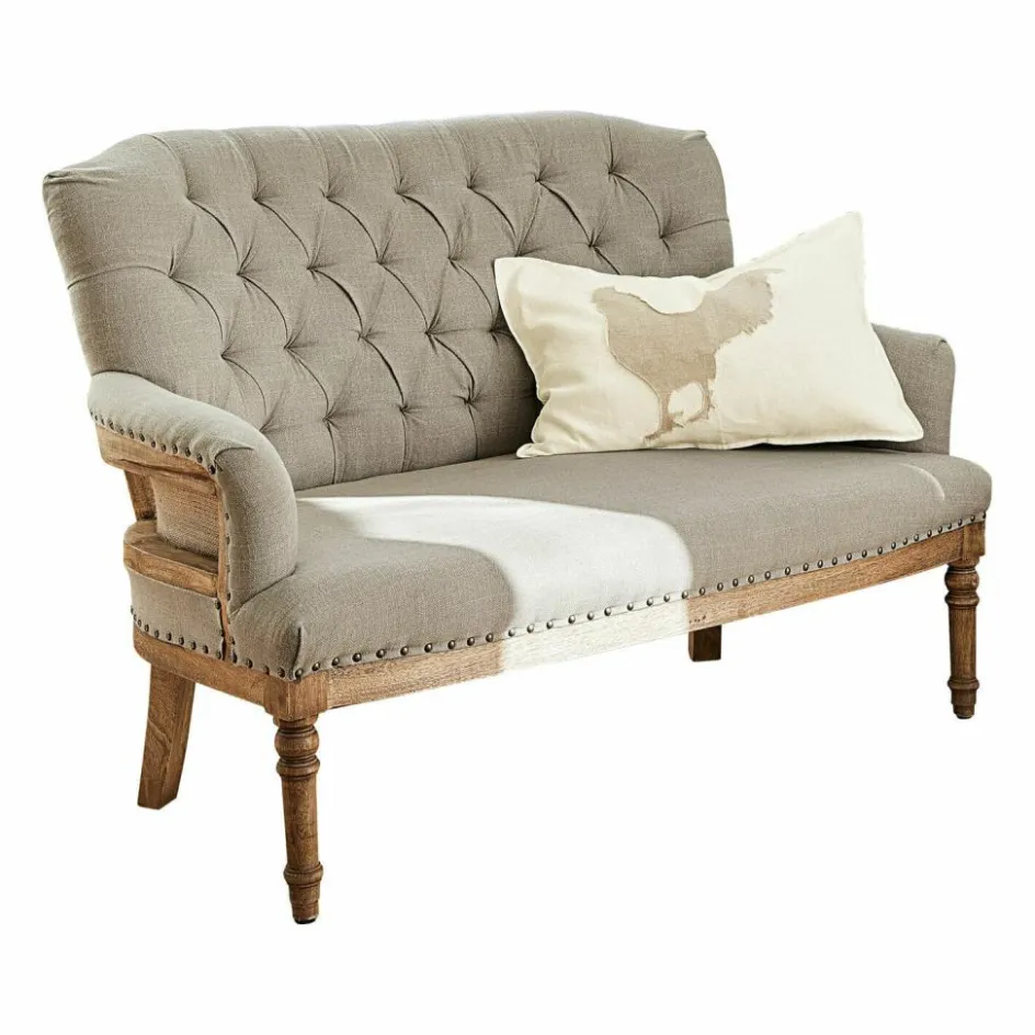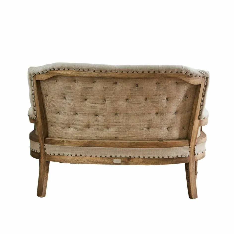 Platz für zwei bietet dieses edle Sofa, das nach englischen Vorbildern von erfahrenen Polsterern gefertigt wird. Sie beherrschen unter anderem die klassische Chesterfield-Steppung mit Polsterknöpfen, die hier die Rückenlehne auf elegante Weise betont. Das Möbel ist weich gepolstert und mit einem robusten und ansprechend strukturierten Webstoff bezogen. Ausgesprochen formschön sind die leicht geschwungenen Lehnen, die wie eine einladende Umarmung wirken. Und die angenehm tiefe Sitzfläche ist so bequem, dass man stundenlang verweilen möchte. Ziernieten aus Messing und das stabile Untergestell aus Mangoholz mit gedrechselten Beinen machen das Bild vollkommen. Vintage-Chic der exquisiten Art – ein stilvolles Schmuckstück für das Wohnzimmer, Gästezimmer oder Kaminzimmer.