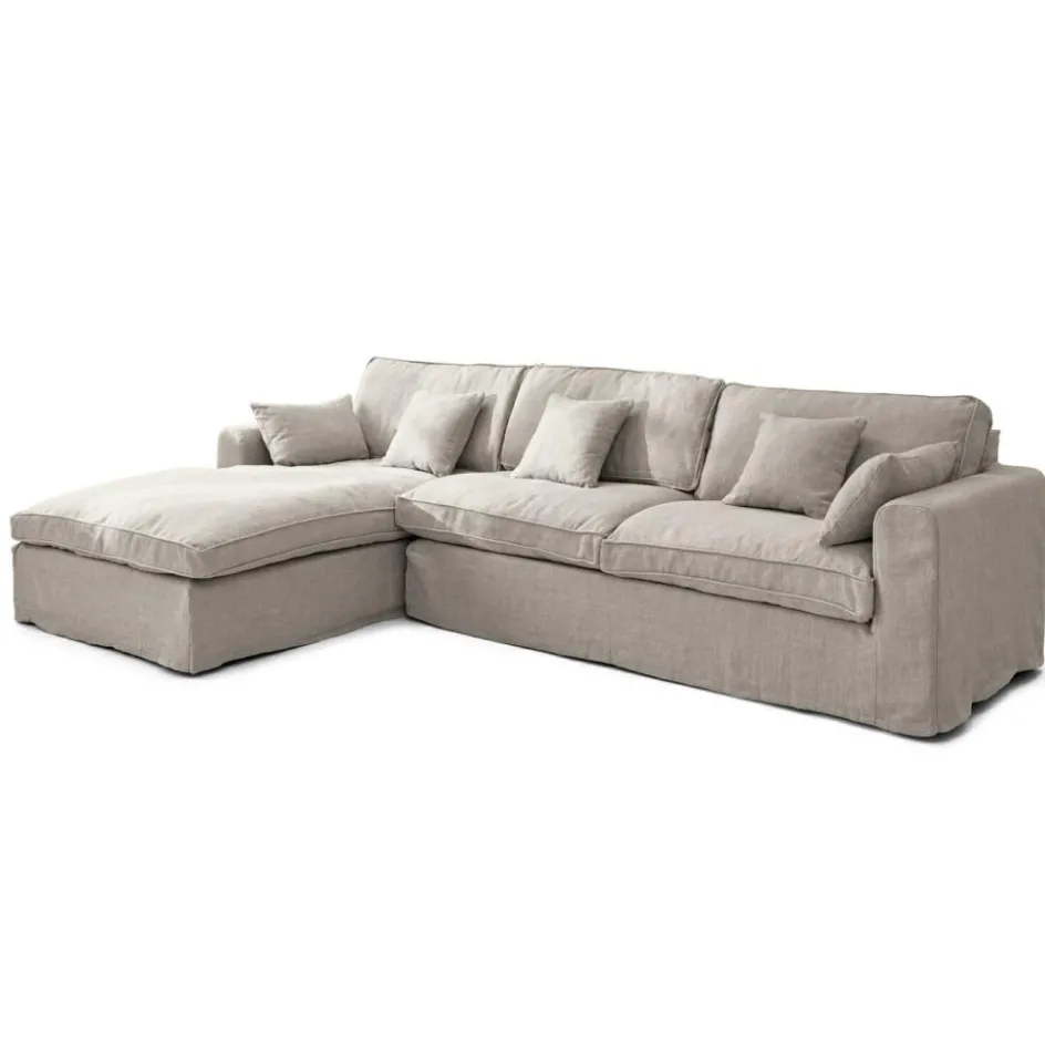 Wieso Ausgehen? Bleiben Sie einfach daheim. Mit diesem Sofa verwandeln Sie Ihr Wohnzimmer in einen absoluten Hot-Spot. Die große Couch mit eingebauter Récamière besteht aus einem stabilen Massivholzgestell und einer hochwertigen Schaumstoffpolsterung – genug Platz zum Ausstrecken inklusive. Darüber hinaus punktet das Sitzmöbel mit einem robusten Bezugsstoff, einer exzellenten Verarbeitung und acht zusätzlichen Kissen mit aufwendig gearbeiteten Kedernähten.