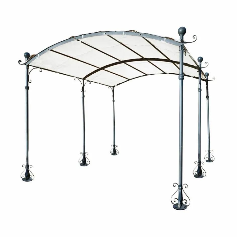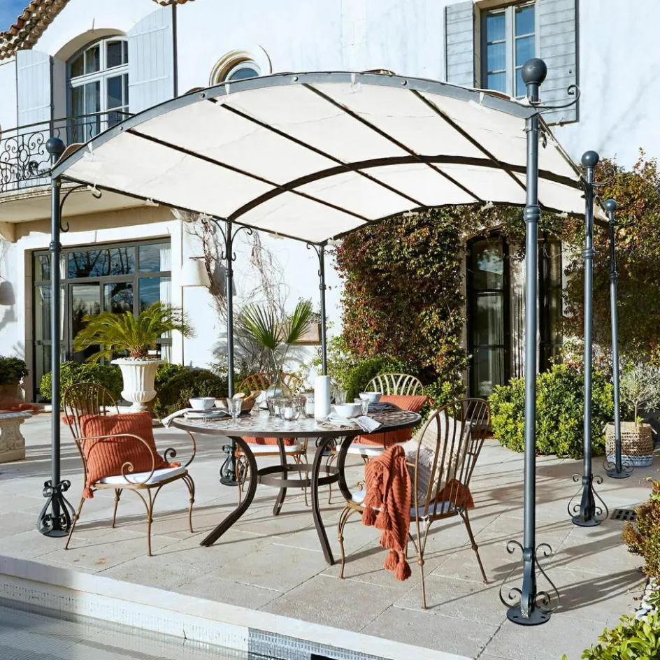 Ein herrlicher Sommermorgen und Sie beschließen, schon das Frühstück unter dem Dach Ihrer neuen Pergola einzunehmen, denn die Atmosphäre dort ist von ganz besonderem Reiz. Den auch Ihre Gäste spüren werden, wenn Sie diese am Abend dort willkommen heißen. Überdacht und doch unter freiem Himmel, offen und dennoch geschützt kreiert die Pergola einen luftigen, klar umrissenen Raum innerhalb Ihrer Gartenanlage, in dem sich jeder wohlig geborgen fühlen wird. Zugleich bildet sie auch einen bezaubernden Blickfang in Ihrem grünen Refugium. Vor allem, weil die filigrane Konstruktion von einer so luftig leichten, schwebenden Eleganz ist, wie sie typisch ist für die traditionelle französische Schmiedekunst. Werden die stabilen Stützen von imposanten Eisenkugeln gekrönt, konnte der Kunsthandwerker nicht widerstehen, die Füße mit zierlichen Ornamenten zu schmücken. Die freitragende Eisenkonstruktion garantiert nicht nur beste Standfestigkeit, sie wurde auch durch eine besonders hochwertige Pulverbeschichtung mit besten Outdoor-Eigenschaften ausgestattet. Das Dach besteht aus modernem Stoffgewebe, das sich ebenfalls mit bester Robustheit und Witterungsbeständigkeit empfiehlt. Genießen Sie an jedem schönen Sommertag, wie die Sonnenstrahlen durch das Dach sanft gemildert werden, während ein laues Lüftchen für optimale Wohlfühltemperatur in der Pergola sorgt. Im Winter raten wir dazu das Dach abzunehmen, damit es Ihnen lange erhalten bleibt.