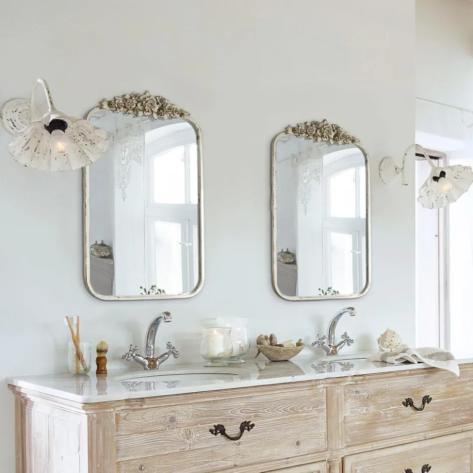 Wer romantisches Interior liebt, findet in diesem prachtvollen Blickfang wahrscheinlich das neue Lieblingsstück. Man könnte fast meinen, es handele sich um ein sehr altes Objekt, das über viele Jahrzehnte hinweg die Wand eines eleganten Anwesens auf dem Land geschmückt hat. Ein wunderschöner Rahmen aus Eisen umrandet die großzügige Spiegelfläche. Den oberen Bereich ziert ein kunstvoll gestaltetes, florales Ornament. Es verleiht dem Objekt eine besonders romantische Note. Die authentisch gearbeiteten Abnutzungsspuren im hellen Lack betonen den verträumten Vintage-Charme des Spiegels. Durch diese Art der Verarbeitung erscheint der Rahmen je nach Lichteinstrahlung immer in einer etwas anderen Farbgebung. Das macht den Spiegel tatsächlich einzigartig. Für eine stabile Befestigung an der Wand sorgen die zwei Haken auf der Rückseite. Sehr schön sieht dieser Eyecatcher auch an die Wand gelehnt aus, etwa auf einer nostalgischen Kommode oder einem Konsolentisch. Das reizvolle Design passt ganz hervorragend zum beliebten Shabby Chic und zum französischen Landhaus-Stil. Auch zu klassischem Interior setzt dieser Hingucker einen einzigartigen Akzent. Ob im Schlafzimmer, im Flur, im Ankleidezimmer oder im Wohnzimmer – mit diesem Teil entsteht in jedem Raum sofort ein zauberhaftes Ambiente.